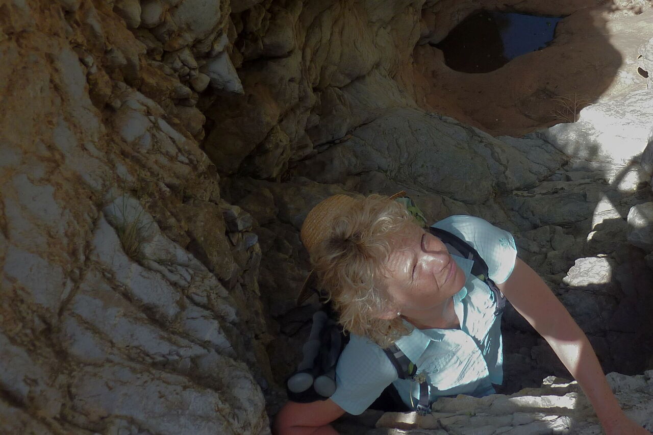 Vom (01) Start und Ziel (365 m) laufen wir auf der Asphaltstraße Richtung Kritina bis in die Linkskurve und steigen, hier rechts hinter der Leitplanke, in die Schlucht hinein. Es folgt der erste Höhepunkt, die Schlucht verengt sich und wir steigen über stufenförmig geschichtete Gesteinsschichten und erreichen eine erste Gumpe.