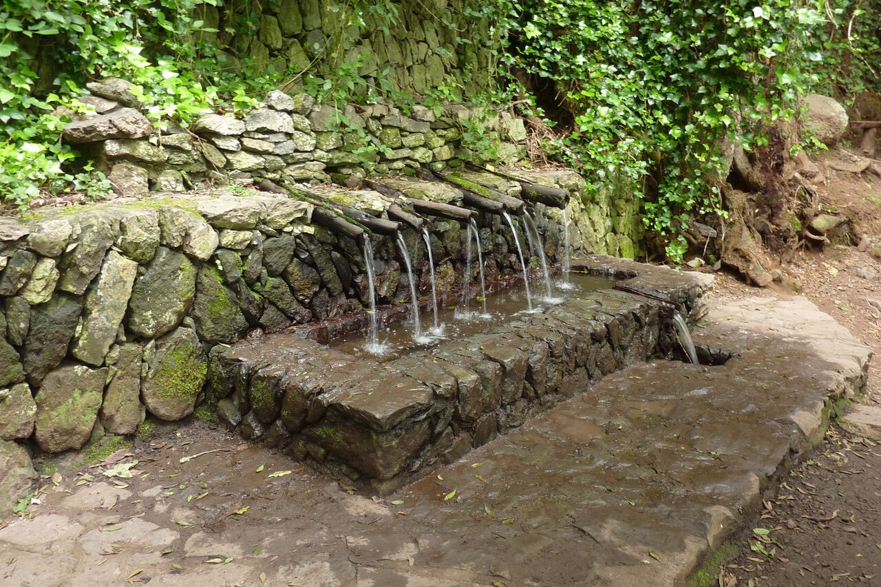 Wir gehen die wenigen Meter zurück und nun links die Treppen hoch, queren eine Asphaltstraße, um links die Treppen an dem roten Haus vorbei zu nehmen. Wir erreichen die Hauptstraße nach Alojero, queren diese und beginnen in engen Kehren den Aufstieg. Vor einem Treppenweg gehen wir 20 m rechts bis zu den magischen Quellen von La Gomera, den (05) Chorros de Epina (783 m). Dort befinden sich sieben ausgehöhlte Äste, aus denen Quellwasser in das darunter liegende Naturbecken plätschert - eine Volksweisheit der Ureinwohner besagt, dass das Quellwasser magische Kräfte besitzt. Wir gehen wieder zurück bis an den Treppenweg, um diesen aber nicht rechts hoch, sondern geradeaus weiterzugehen. Auf einem schmalen Pfad erreichen wir den Ausgangspunkt.