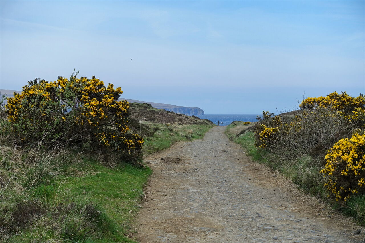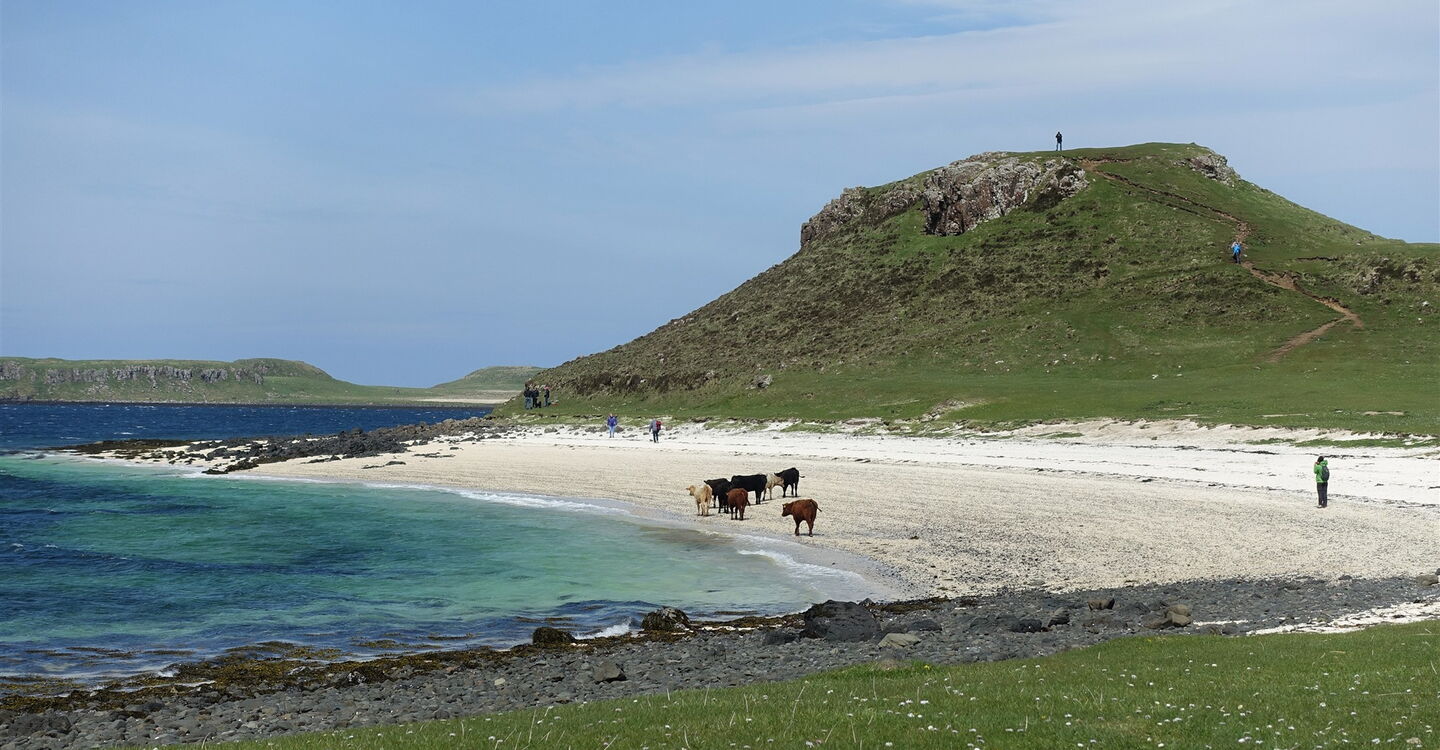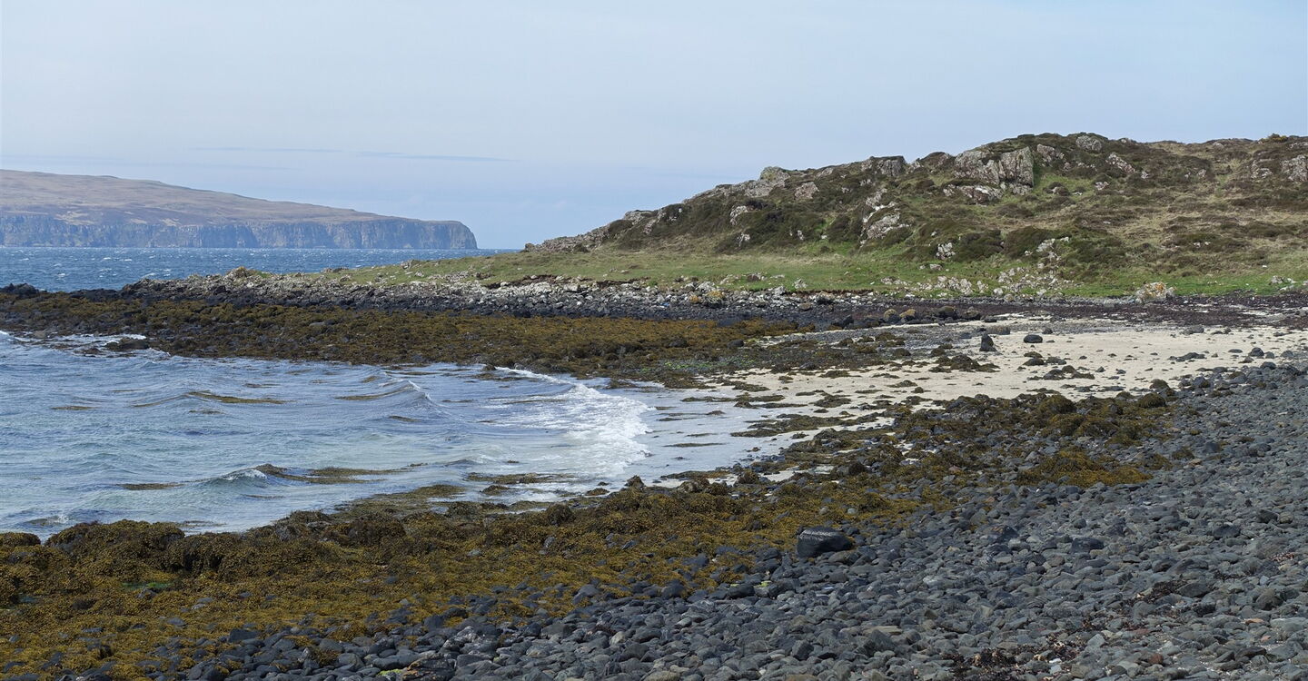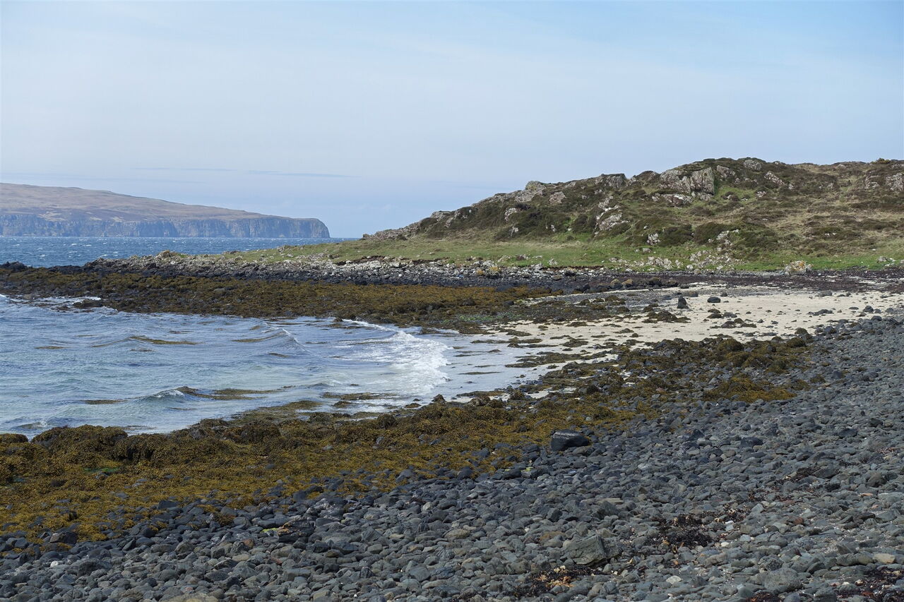 Bei einem einzelnen Haus und der darauffolgenden Pforte geht es dann auf einer Piste weiter. Einen links bergauf führenden Weg ignorieren wir, kurz später passieren wir ein weiteres Gatter. Achtung! Bei einer Linkskehre der Asphaltstraße – hier befindet sich ein mintgrüner abgestellter alter Lastwagen – verlassen wir die Straße nach halb rechts. Vor einem einzelnen Haus verläuft der Pfad halb rechts Richtung Meer. Wir erreichen die Bucht von 02 Kilmarie (3 m), einst Heimat von Iain Anderson, dem Frontmann von der 1967 gegründeten Band Jethro Tull. An der Hauptstraße B8083 biegen wir links ab und gehen bis zu einem Parkplatz vor.