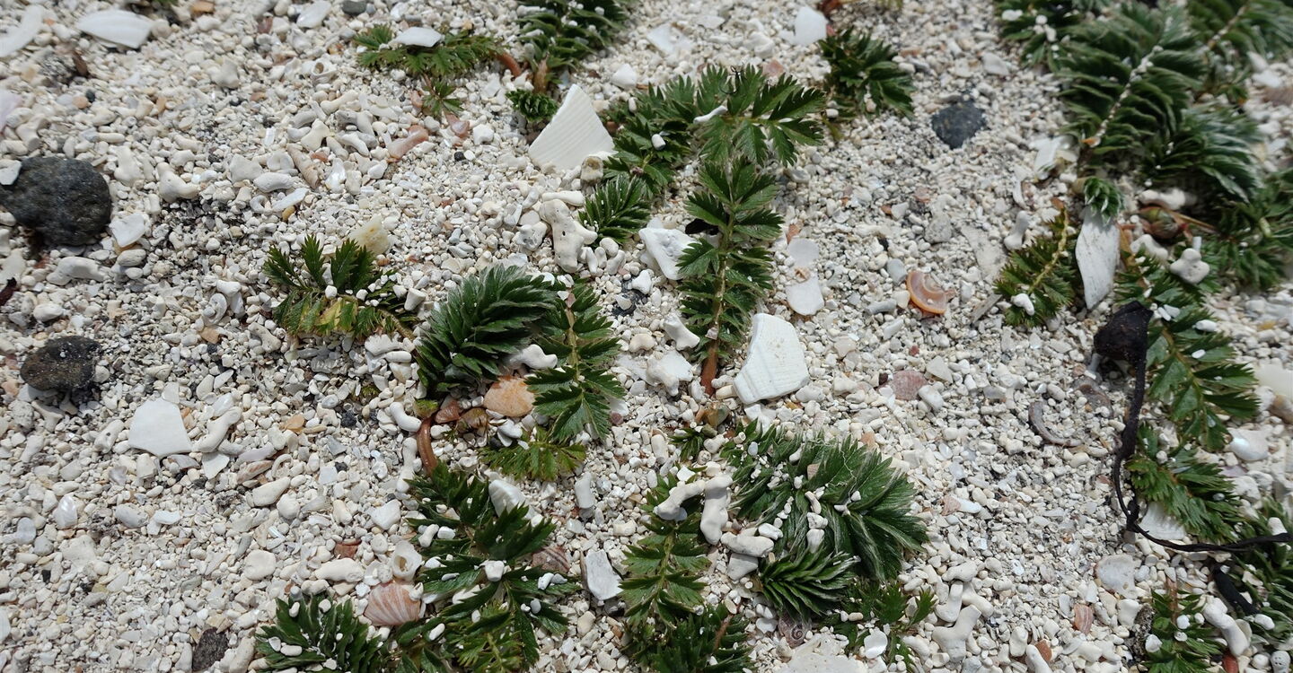 Kurz führt der Pfad über erodierten Boden, bis wir dann auf grasbewachsenem Untergrund den 04 Coral Beach (2 m) erreicht haben. Der Strand besteht aus zerriebenem Red Coralline, einem korallenartigen Seetang (auch bekannt als Maërl), der das Wasser tropisch blau erscheinen lässt – ja, wenn die Sonne scheint. Auf der vorgelagerten Insel wächst der Seetang ca. 1 mm pro Jahr! So nahm man fälschlicherweise an, dass der Strand aus abgestorbenen Korallen bestand.