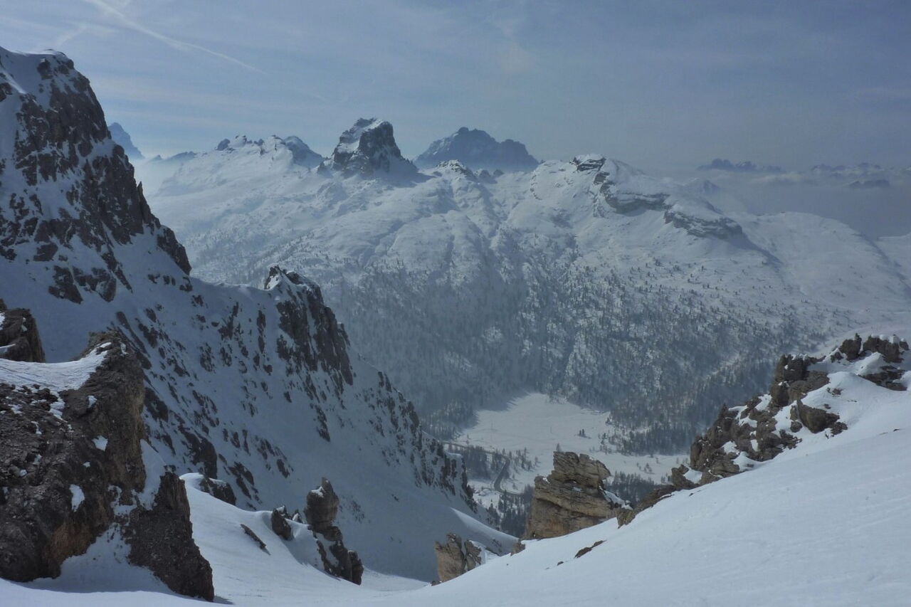 Der 1956 durch die Olympischen Winterspiele bekannt gewordene Ort Cortina d'Ampezzo liegt in traumhafter Landschaft, umgeben von den Gipfeln der Tofana di Mezzo 3243 m, Monte Cristallo 3218 m und Punta Sorapis 3205 m. Bisher gehört die Dolomitengemeinde zur venetischen Provinz Belluno und nicht zu Südtirol, trotzdem wird auch hier Ladinsch gesprochen. Ohne Frage in Cortina d'Ampezzo trifft man Gäste aus der ganzen Welt und besonders auf der Flaniermeile im Dorfkern. Die drei Skigebiete Faloria Cristallo Mietres, Tofan Ra Valles und Lagazuoi 4 Torri, mit 38 Bergbahnen und 120 Pistenkilometer, sind absolute Spitzenklasse. Wir sind aber gekommen um die Variantenabfahrten in dieser Region zu erkunden.