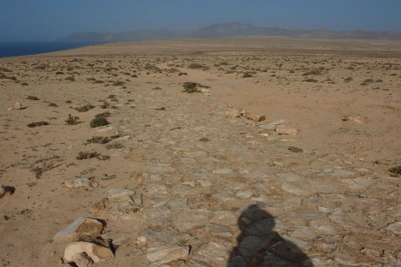 Auf dem Plateau angekommen, orientieren wir uns an einem türkisfarbenen Holzpfeiler, der am ca. 130 m entfernten Hauptweg steht. Dort gehen wir rechts, um nach 270 m – 25 m vor dem zweiten Holzweiler – links über den Sandhaufen zu steigen und auf dem schwer auszumachenden Pfad weiterzuwandern. Im weiteren Verlauf queren wir drei Sandpisten, bis bei der nächsten Kreuzung rechts von uns – in 15 m Entfernung – ein Metallpfeiler steht. Hier gehen wir nun links, verlassen diesen Weg aber bereits nach 125 m wieder. Stattdessen gehen wir nun weglos auf ein Steinmännchen und einen in der Entfernung gut erkennbaren Wegweiser der Inselregierung zu. Wir sehen die Überreste eines alten (05) Pflasterwegs (117 m) und gehen hier 150 m nach links, um dort wieder rechts zu laufen. Nachdem wir die rechts von uns liegenden Windräder passiert haben, gehen wir bei der nächsten Gelegenheit links, um nach weiteren 125 m rechts auf der breiten Piste am Absperrzaun der Autobahn anzukommen. Von dort sind es noch ca. 500 m bis zum Parkplatz.