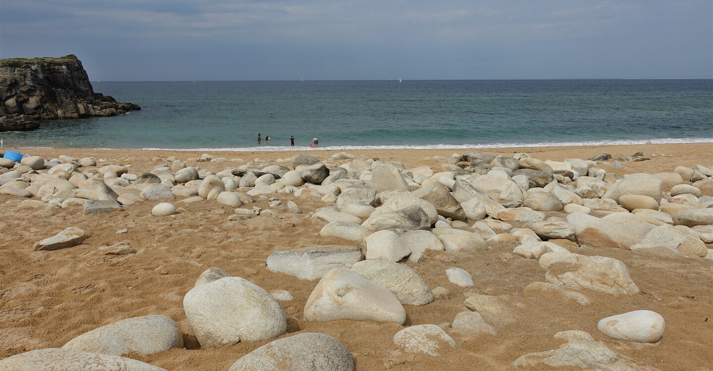 Die Promenade endet und wir gehen nun auf einem ausgewiesenen Wanderweg, bis wir den ersten atemberaubenden Aussichtspunkt erreichen, das 02 Kap Beg er Goalennec (8 m) – man schaut fast endlos in nördliche Richtung entlang der zerklüfteten Küste. Hinter einer kleinen Hütte am Parkplatz beginnt der weiterführende Pfad. Auf einem Holzbohlenweg passieren wir eine nicht besonders schöne Sandbucht. Kurz später endet der Pfad, wir gehen links und gelangen so wieder auf einen Pfad. Bei einem großen Stein erreichen wir den Aussichtspunkt Grote de Kerniscop und kurz später die erste schöne Sandbucht, den Port Guibello.