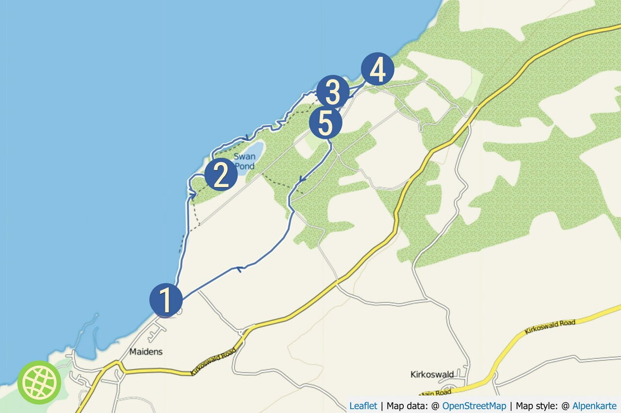Die Erkundungsrunde beginnt beim 01 Beach car park (2 m) am nördlichen Ende des kleinen Dorfes Maidens. Von dort aus geht es herunter an den Strand und anschließend rechts in nördliche Richtung. Je nach Stand der Tide kann man direkt am Strand gehen oder auf dem Fußweg oberhalb der Küstenbefestigung. 300 m hinter einem kleinen Bachlauf, der in das Meer fließt, verlassen wir den Strandabschnitt über Holztreppen und gelangen in den Wald oberhalb der Klippen. Dort angekommen gehen wir links, bei der nächsten Weggabelung erneut links und bei der darauffolgenden Weggabelung rechts. Im Mai blüht der Ginster farbenfroh und unter den Bäumen befindet sich ein Meer aus blauen, rundblättrigen Glockenblumen.