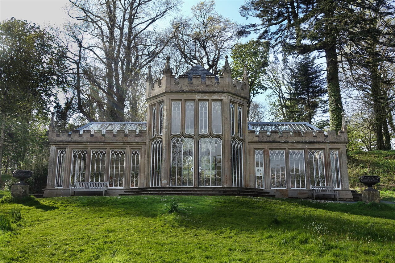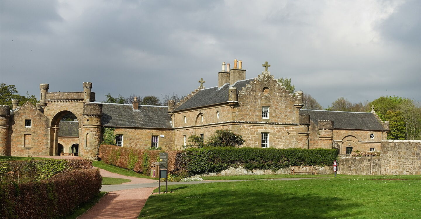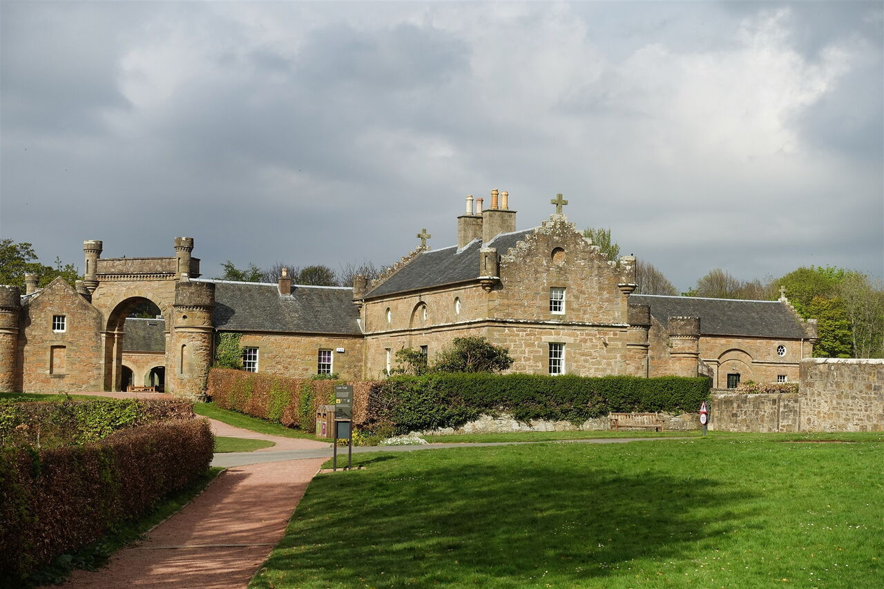 Durch den rechten oder linken kleinen Turm bei der Rasenfläche am Springbrunnen erreicht man den Vorplatz des Schlosses. Durch die großen Torbögen, vorbei an dem links unterhalb liegenden Gashaus, geht es in Richtung des 04 Culzean Country Park Visitor Centre (31 m). Die Öffnungszeiten sind vom 1. April bis 31. Oktober 9:00–17:30 und vom 1. November bis 31. März samstags und sonntags 11:00–14:00. Der Park ist das ganze Jahr über von 9:30 bis zum Sonnenuntergang geöffnet. Wir gehen ein kurzes Stück auf dem Hinweg zurück und bei der Weggabelung dann weiter auf dem Weg mit dem roten Untergrund, dem Lions Trail. Der Weg mündet in eine Straße, auf der wir geradeaus weitergehen. Baumähnliche Rhododendren säumen den Weg. Links oberhalb, hinter dem Parkplatz, befindet sich der Hirschpark.