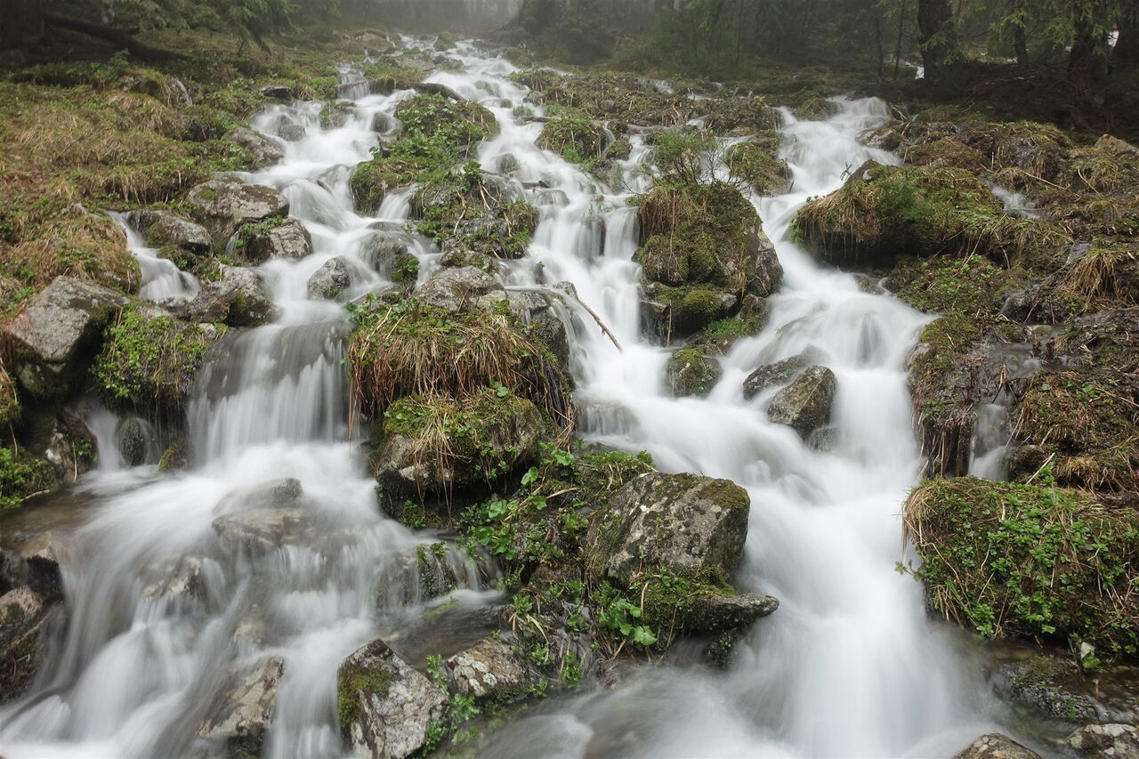 50 m bevor die Piste nach halb links den Bachlauf queren würde, zweigen wir abermals halb rechts ab. Auch hier befinden sich grüne Markierungen. Wir erreichen die Informationstafel mit der Nummer 10. Der nachfolgende Aufstieg führt durch einen ursprünglichen und intakten Wald. Wir erreichen die Informationstafel mit der Nummer 9. Unser Weg endet am 02 Záver Širokej doliny (1416 m) und wir gehen nicht geradeaus weiter, sondern rechts auf dem rot markierten und mit Felsen verlegten Pfad. Wir überqueren zwei Bachbetten und erreichen die Informationstafel mit der Nummer 8 sowie die Schneise einer Skipiste. Diese überqueren wir, um am rechten Pistenrand bei roten Wegweisern den Aufstieg fortzusetzen.