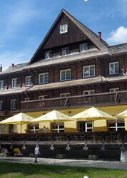 Entlang eines romantisch gelegenen Sees wandern wir über eine Holzbrücke. Bei Brhliská sehen wir rechts unterhalb weitere Liftanlagen, gehen aber den eingeschlagenen Weg Richtung 04 Tri vody (1370 m) weiter und kommen an der Informationstafel 5 vorbei. Bei Tri vody endet dann der Pfad, während wir rechts auf dem gelben Wanderweg bergab marschieren – die Informationstafeln 4 und 3 liegen am Wegesrand. Die Wegfindung auf dem nun folgenden längeren Abstieg ist eindeutig. Wenn wir bereits ein längeres Stück auf der Asphaltstraße gegangen sind, biegen wir vor dem Hotel Sorea Marmot halb rechts auf einen Pfad ab, sodass wir nun rechts an diesem Hotel vorbeigehen. Vor mehreren Häusern folgen wir nicht dem weiterführenden Weg durch die Rechtskehre, sondern gehen halb links auf einem Pfad bis zur unterhalb liegenden Straße. Diese queren wir und kommen direkt am Hotel Mikulášska Chata vorbei.