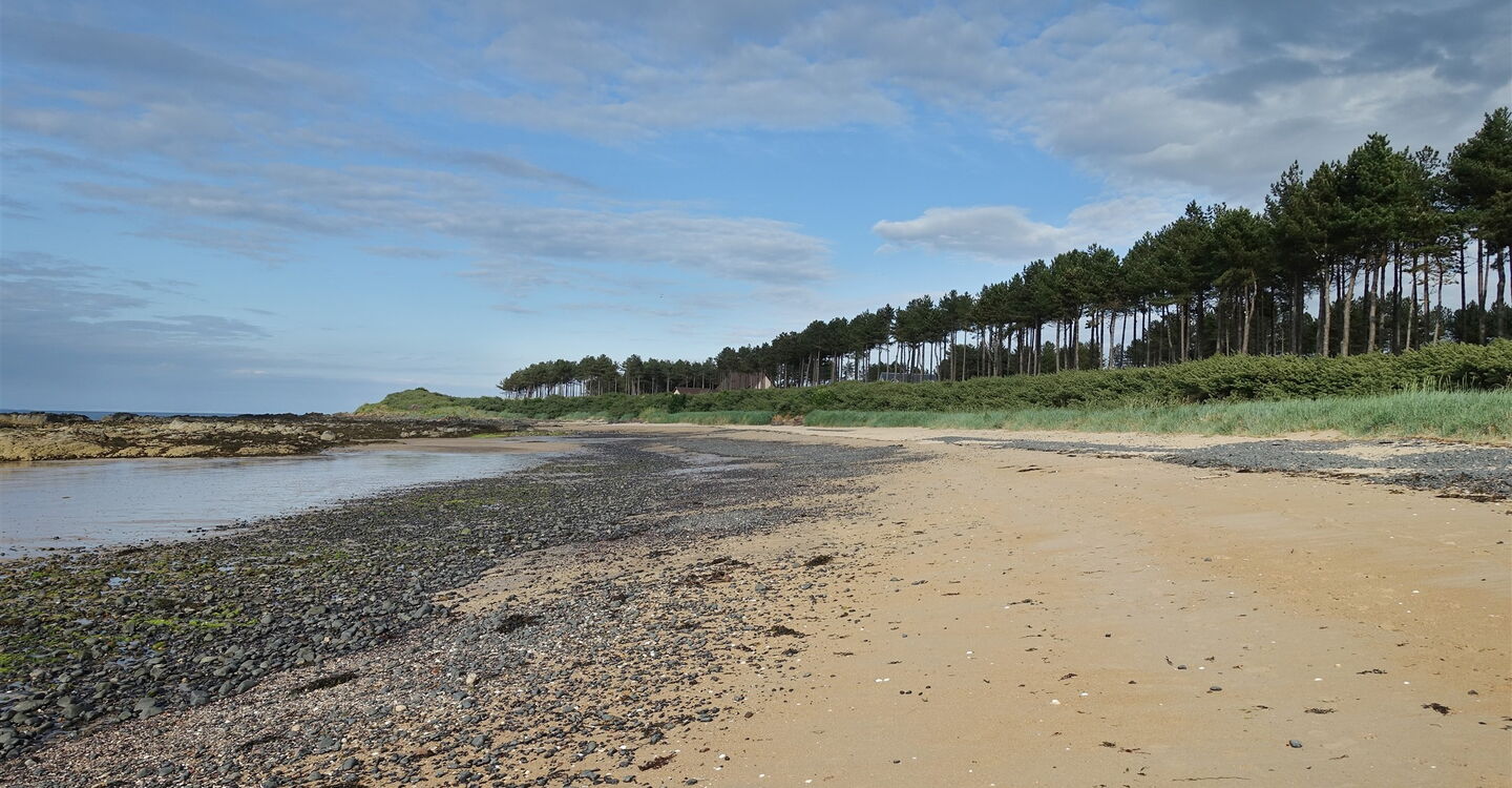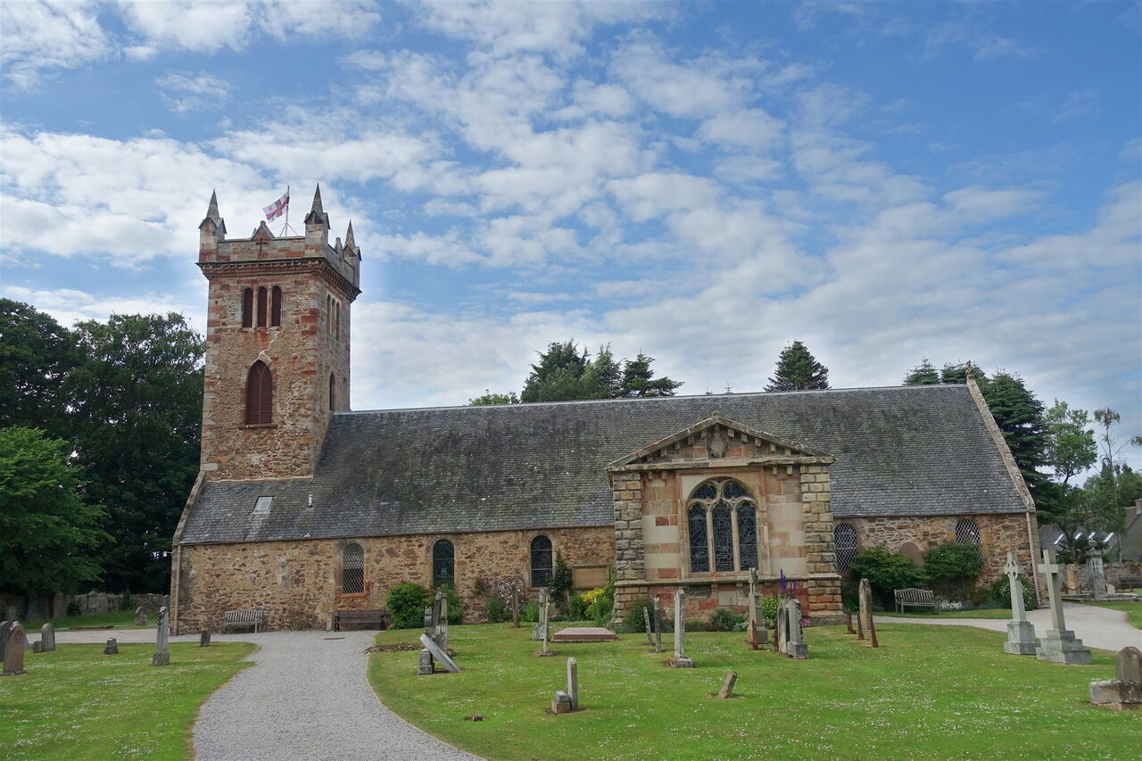Nach der Besichtigung gehen wir ein Stück auf dem Hinweg zurück, dann aber geradeaus weiter in Richtung der 1612 fertiggestellten 03 Dirleton Parish Church (12 m), einem Kirchengebäude der presbyterianischen Church of Scotland. Neben der Greyfriars Kirk in Edinburgh zählt sie zu den frühesten Kirchenneubauten in Schottland nach der Reformation. Von der Kirche kommend, gehen wir an dem grünen Platz links und folgen weiterhin der Ausschilderung John-Muir-Weg. Nachdem wir die letzten Häuser hinter uns gelassen haben, geht es über die Felder direkt auf eine große Baumreihe zu und ein kurzes Stück an dieser entlang. Bei einem grünen Gatter gehen wir kurz links, um dann sofort wieder rechts zu gehen, nun durch den Wald.