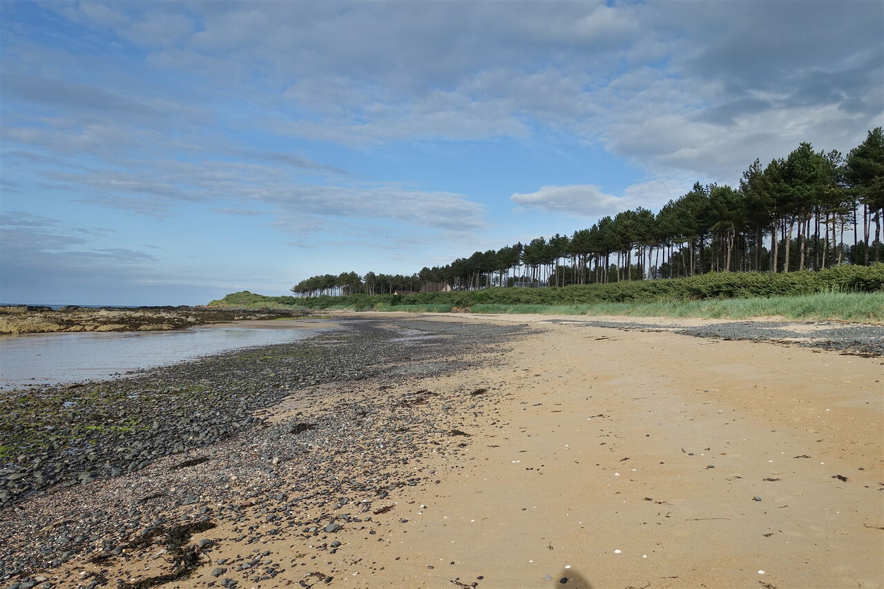 Der Pfad endet vor einem Kinderspielplatz, wir gehen links auf einem der vielen Pfade bis zum Meer. Je nach Wasserstand kann man direkt am Strand gehen oder man wählt den Pfad parallel zum Strand. Gehen wir am Strand, so müssen gelegentlich felsige Stellen umlaufen werden. Auf der rechten Seite sehen wir auf einer kleinen vorgelagerten Insel ein 04 Lighthouse (3 m). Prachtvolle Villen stehen im windgeschützten Kiefernwald. Bei riesigen Kieselsteinen gehen wir nun links etwas oberhalb der Klippen. Hinter den sogenannten Weaklaw Rocks kann man wieder am goldbraunen Strand entlanggehen, der mit extrem vielen Muscheln durchsetzt ist.