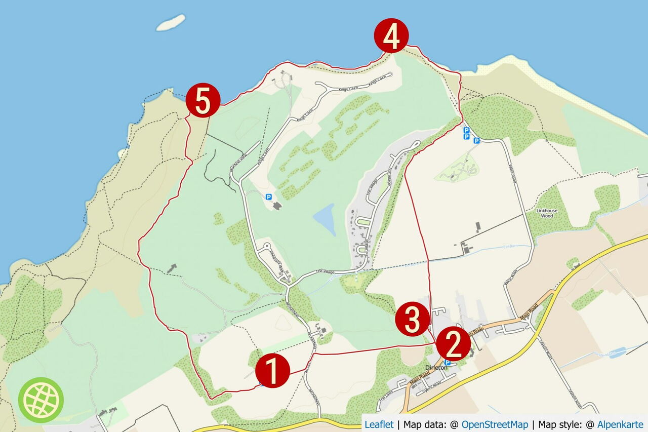 Sobald wir links oberhalb in den Dünen mehrere große Baumstämme mit einem Feuerplatz sehen, verlassen den 05 Beach (5 m) und gehen nun entlang des Golfplatzes. Bei der darauffolgenden Weggabelung sehen wir halb rechts das Meer und gehen halb links durch die Dünenlandschaft. Es folgen viele Wegverzweigungen: Bei der folgenden Weggabelung gehen wir halb links durch ein kleines Waldstück. Dort, wo der Pfad endet, gehen wir halb rechts auf der Schotterpiste weiter. Nach kurzem Aufstieg lassen wir zwei weiße Pfeiler mit roten Warnhinweisen links liegen und gehen halb rechts an dem eingezäunten Gelände vorbei. An der Weggabelung vor einem Haus gehen wir halb rechts, hinter einem Holzgatter biegen wir links auf die Asphaltstraße ab und erreichen den Parkplatz.