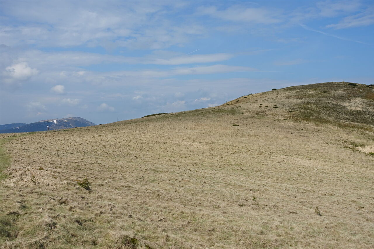 Im Weiteren überqueren wir den Malá Chochuľa (1719 m) und erreichen nachfolgend den 03 Veľká Chochuľa (1753 m) – der höchste Gipfel auf der heutigen Etappe. Oft wehen starke Winde auf dem exponierten Bergrücken, dann wird es schnell kühl, besonders wenn Wolken und Regen dazukommen. In diesem Fall wird auch die Sicht sehr schlecht, trotzdem ist die Orientierung aufgrund der vorzüglichen Wegmarkierungen kein Problem.