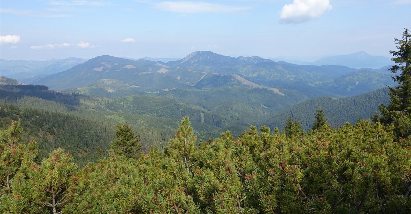 Kontinuierlich steigen wir durch einen Wald und Wiesengelände sowie über einen breiten Bergrücken auf. Dabei kommen wir an dem links oberhalb liegenden Gipfel 02 Handliarka (1189 m) vorbei. Zu dem nachfolgenden Sattel Hiadeľské sedlo müssen wir steil absteigen. Hier haben wir einen Berührungspunkt mit der in diesem Wanderführer beschriebenen Tour 20. An dieser Stelle könnte man nach Korytnica-kúpele absteigen. Ca. 100 m südlich dieses Sattels mit seinen Hochspannungsmasten befindet sich eine Notunterkunft, nochmals 100 m weiter bergab befindet sich eine Quelle. Von nun an beginnt ein kräftiger Aufstieg auf einem Karrenweg und später auf einem Pfad bis oberhalb der Baumgrenze. Wir erreichen den 1675 m hohen Gipfel Prašivá, der durch einen einfachen Holzstock markiert ist.