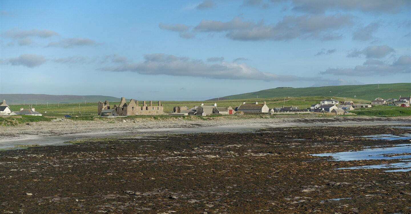 Nach 600 m erreichen wir die gering befahrene Anfahrtsstraße und folgen dieser rechts herunter zum 05 Earl's Palace (Birsay) (12 m). Ein verbauter Stein zeigt die Jahreszahl 1574. Das Gebäude diente als Ersatz für den Earl's Palace in Kirkwall und ein Jahrhundert später nutzten es die Earls of Morton. Seit dem 17. Jahrhundert ist das Bauwerk nicht mehr bewohnt und somit dem Verfall preisgegeben.