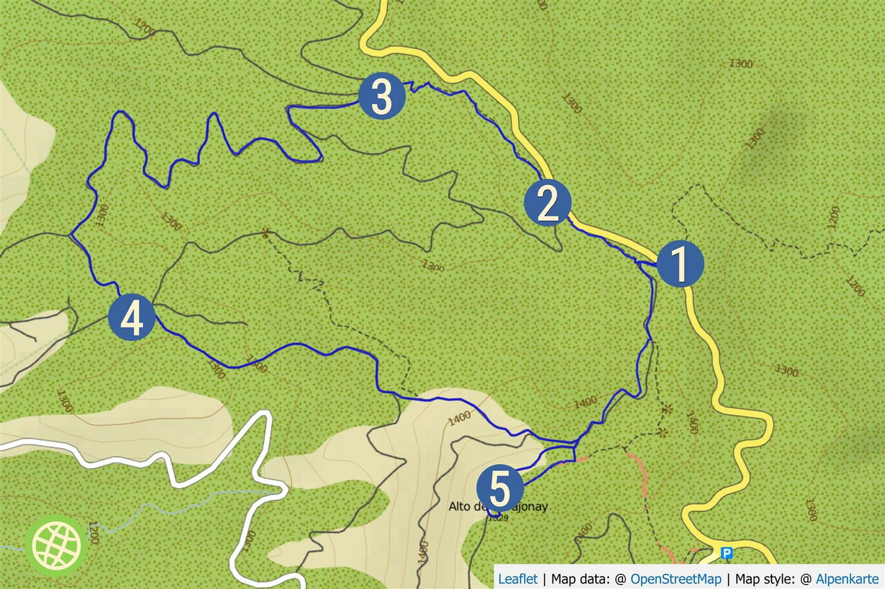Vom (01) Start und Ziel El Contadero (1362 m) beginnt auf der gegenüberliegenden Seite des Parkplatzes der gepflasterte Weg Richtung Alto de Garajonay. Nach 120 m verlassen wir diesen Weg nach rechts, Richtung Laguna Grande.