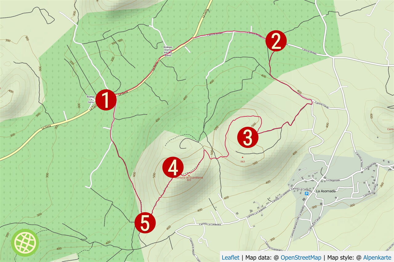 Bei dem Aufstieg zum ersten Vulkan ist der Weg nicht einfach auszumachen und kurzfristig wird der Orientierungssinn gefordert. Wegbeschaffenheit: 30 % Asphaltstraße, 30 % Schotterweg und 40 % Pfade. Einkehr: Auf dem letzten Wegstück liegt die Bodega El Chupadero, oberhalb von La Geria. Diese Wanderung kann zu jeder Reisezeit unternommen werden. Tipp: Das sehr interessant gestaltete Weinmuseum in der Bodega Rubicón in La Geria kann besucht werden.