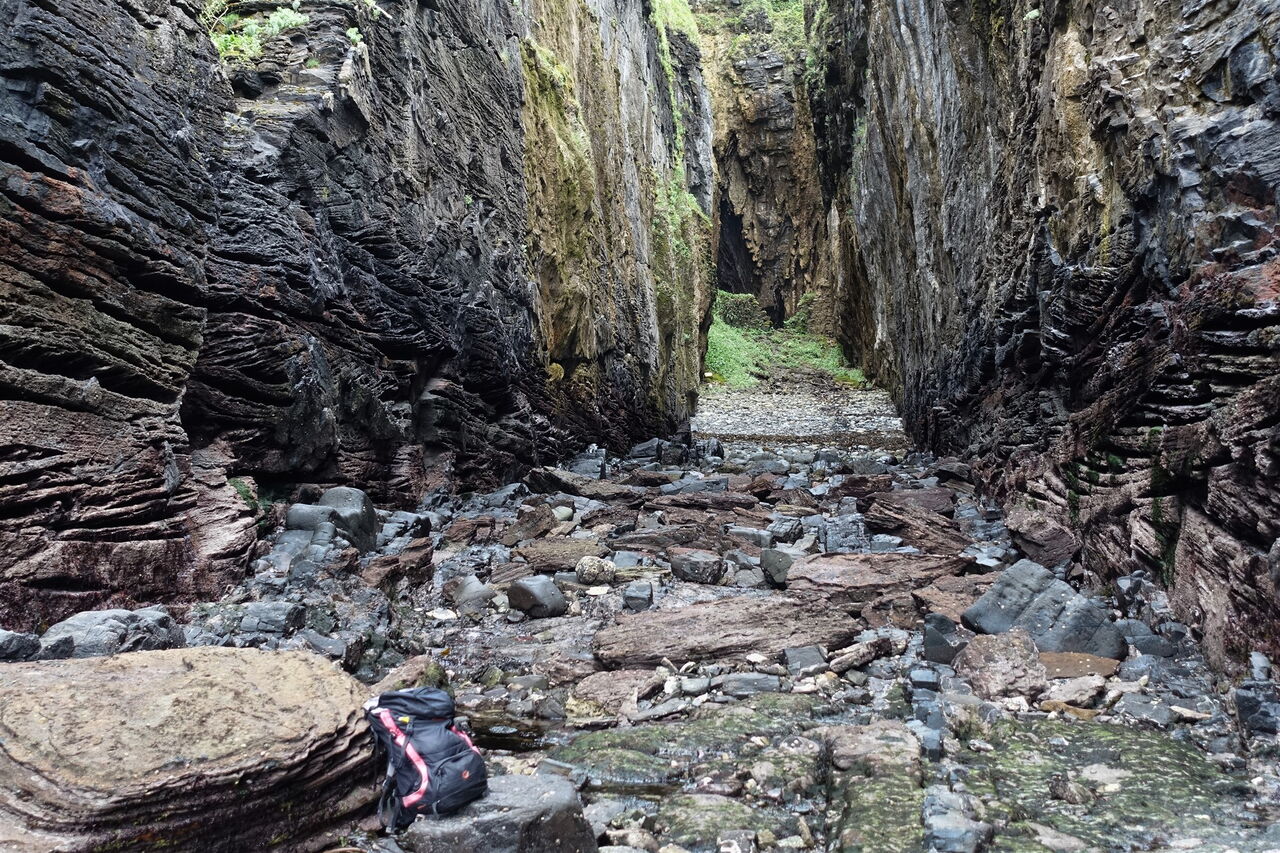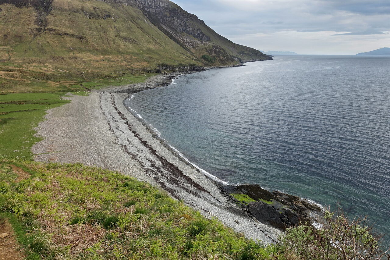 Wir folgen dem weiteren Pfad Richtung Süden entlang der Küste, der zunächst etwas sumpfig ist, sich aber bald verbessert, nachdem er die grasbewachsenen Hänge erklimmt. Windflüchter berichten von windigen Zeiten. Unterhalb des Berges Beinn Leacach führt der Weg steil oberhalb der Klippen entlang. An wenigen Stellen muss man schwindelfrei sein. Es erfolgt der Abstieg in die 04 Schlucht Scaladal (5 m). Hinter der Schlucht steigt der Weg wieder in schwindelerregende Höhen auf.