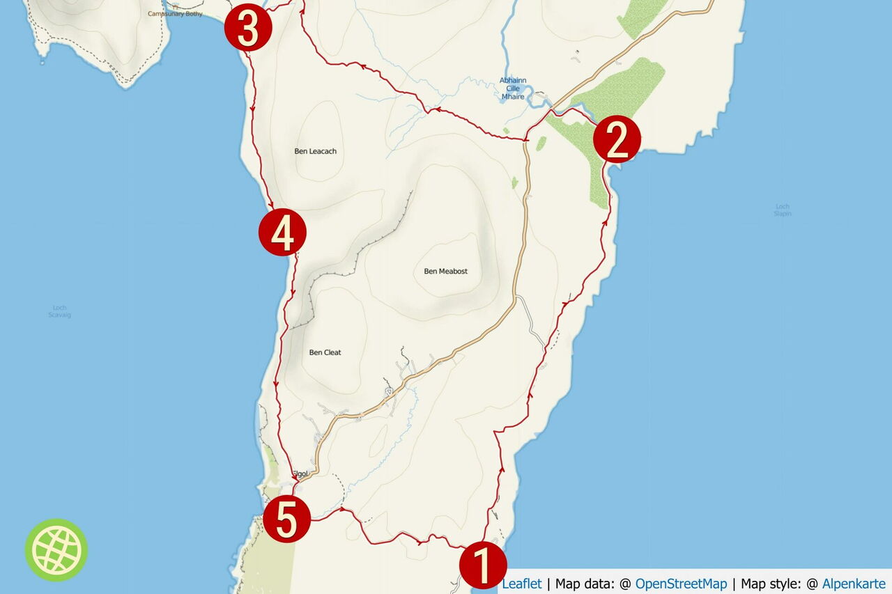 Lange, aber technisch einfache Wanderung. Der Küstenpfad führt an einer Stelle steil oberhalb der Klippen entlang, für nicht ganz schwindelfreie Menschen eine Herausforderung. Art des Weges: 20 % gering befahrene Straße, 40 % Piste und 40 % Pfad. Zusatzausrüstung: Keine. Einkehr: Keine auf der Wanderung. Beste Wanderzeit: Ganzjährig. Variante 1: Man fährt bis zum Ausgangspunkt der Wanderung und schaut sich nur die Spar Cave an. Variante 2: Zwischen Wegpunkt 2 und 3 befindet sich an der Straße ein Parkplatz. Geht man zur Camasunary Bay und auf dem gleichen Weg hin und zurück, so ergeben sich 8 km und ca. 360 Höhenmeter.