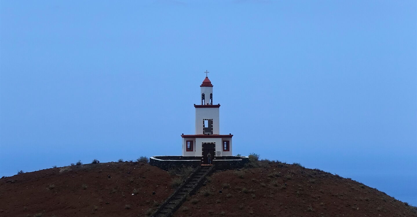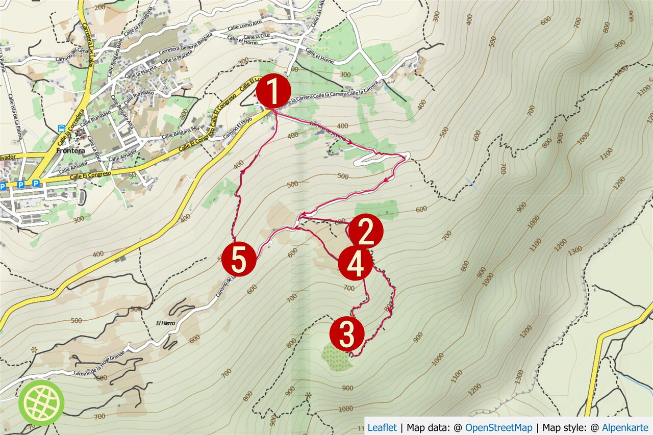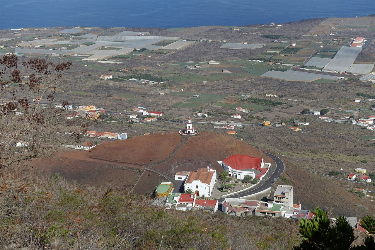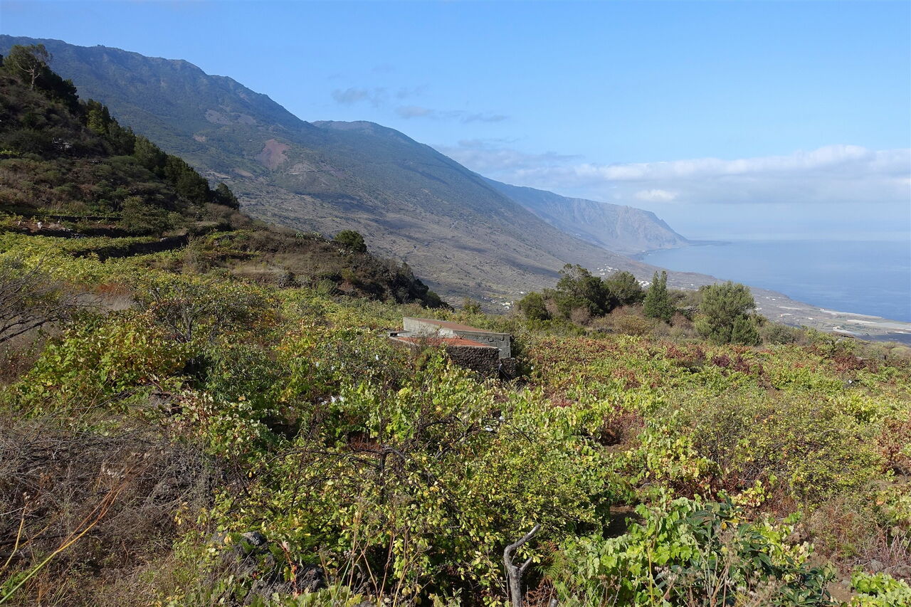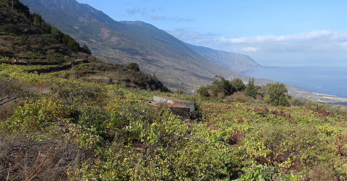 Den Rücken der (01) Ermita de la Candelaria (378 m) zugewandt, verlassen wir den kleinen Dorfplatz über die Stichstraße links neben dem Restaurant. Sofort bei der nachfolgenden Verzweigung gehen wir links bergauf. Hinter den letzten Häusern befinden wir uns bereits in den Weinanbaugebieten von Frontera. Nach 500 m gehen wir in der Rechtskehre der Straße geradeaus auf dem Camino weiter und überqueren die Straße ein erstes Mal, um dann beim zweiten Mal – wo der Pfad in die Straße mündet – nicht geradeaus weiter auf dem Camino Jinama aufzusteigen, sondern rechts auf der Straße weiterzuwandern. Nach weiteren 600 m – kurz hinter einem Felsdurchbruch, durch den die Straße führt – biegen wir links auf die bergauf führende Straße. Bei einer Ruine folgen wir dem Straßenverlauf durch die scharfe Rechtskehre.