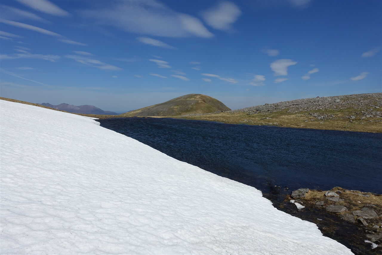 Zwischen diesem See und einem riesigen Stein – wurde wohl an dieser Stelle bei der letzten Eiszeit vergessen – queren wir die Hochebene und folgen im weiteren Verlauf dem weithin sichtbaren Pfad auf den nächsten Gipfel, den 05 Meall a‘ Chrasgaidh (934 m). Über seinen lang gezogenen nordöstlich ausgerichteten Bergrücken beginnen wir mit dem weglosen Abstieg. Sobald dieser Bergrücken an einer felsigen Stelle anfängt in südwestliche Richtung abzufallen, orientieren wir uns mehr halb rechts in Richtung der großen Brücke am See, also an unserem Aufstieg. Sobald wir im Tal den Aufstieg durch das Hochtal ausmachen können, gehen wir unter Berücksichtigung der Geländegegebenheiten möglichst direkt auf diesen Wegpunkt zu. Der Abstieg über die Moor- und Heidelandschaft ist kräfteraubend und bei Nebel eine echte Herausforderung. Sobald wir den Pfad vom Hinweg erreicht haben, gehen wir auf dem bekannten Hinweg zurück.