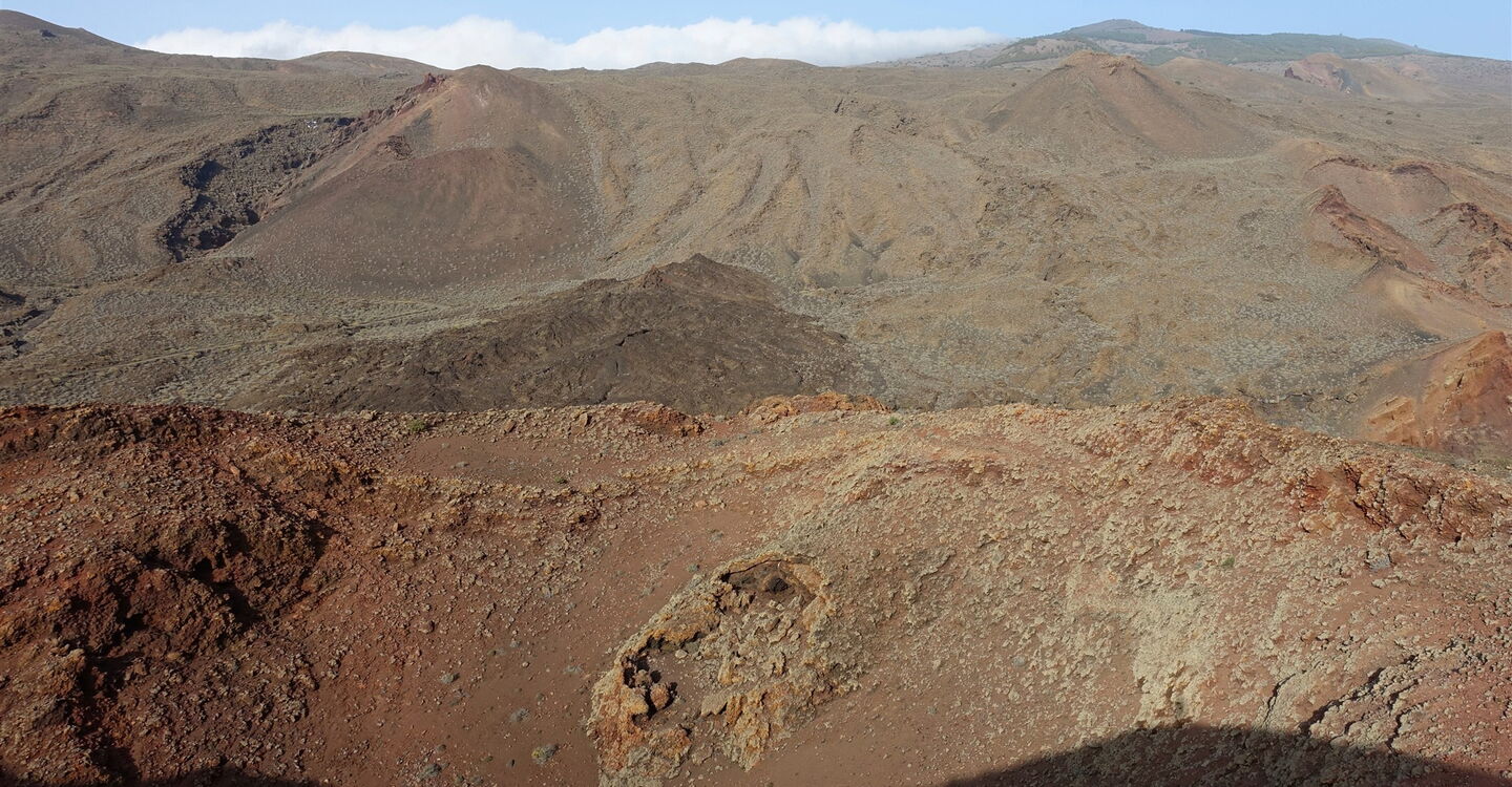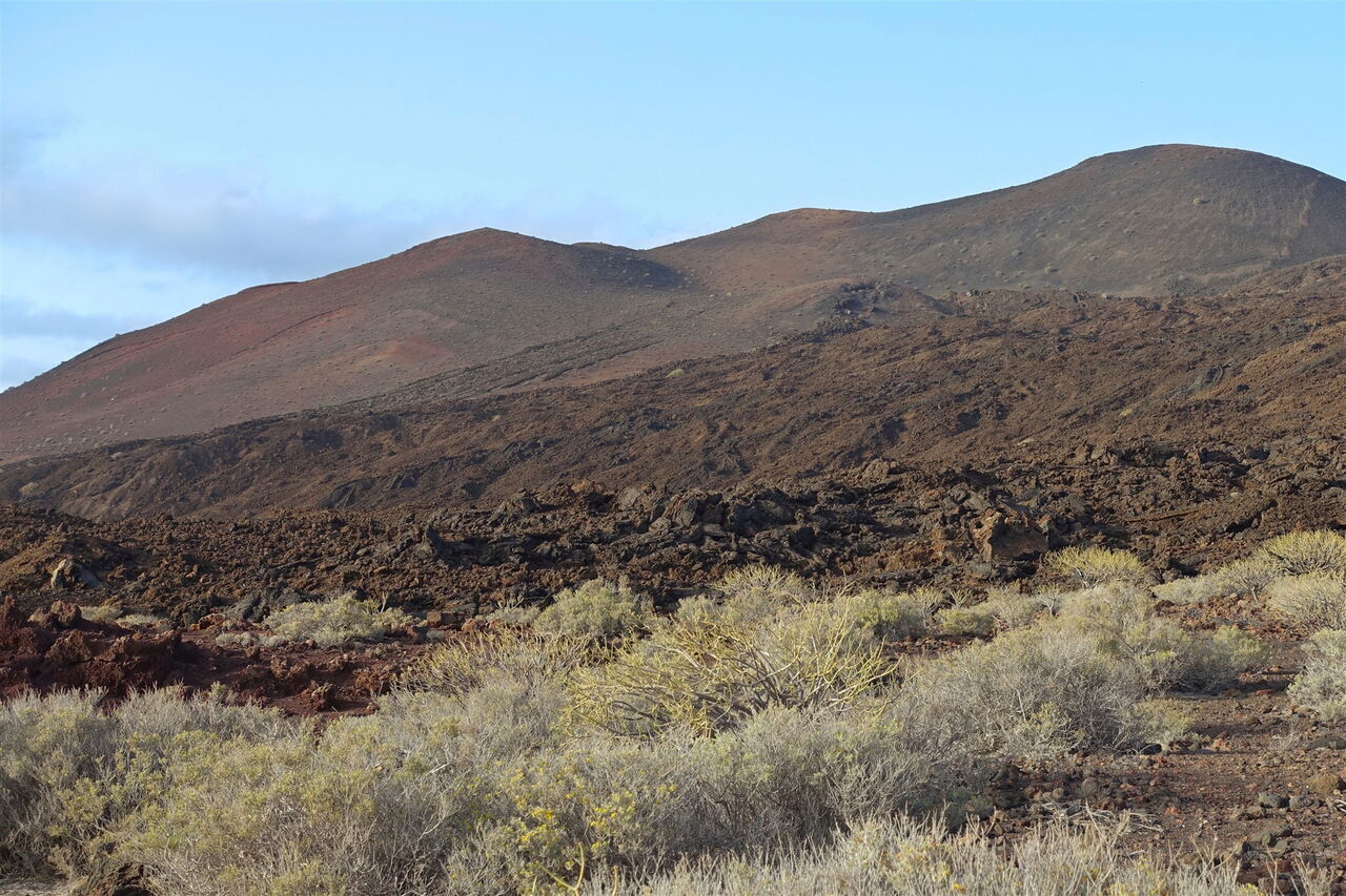Exakt auf Höhe des Abzweigers zum Leuchtturm gehen wir auf der gegenüberliegenden Straßenseite weglos auf einer gedachten Linie zwischen unserem Standort und der weißen Messsäule der (03) Montana de Orchilla (221 m) bergauf. Wir wandern rechts an einem ersten kleinen Vulkankegel vorbei, um dann kurzfristig auf einem Pfad zu einem zweiten Vulkankegel zu gelangen, der halb rechts von uns liegt. Kurz vor zwei mächtigen Vulkanbomben steigen wir links zum Vulkankrater auf, der mit einem herrlichen Panoramablick aufwartet.