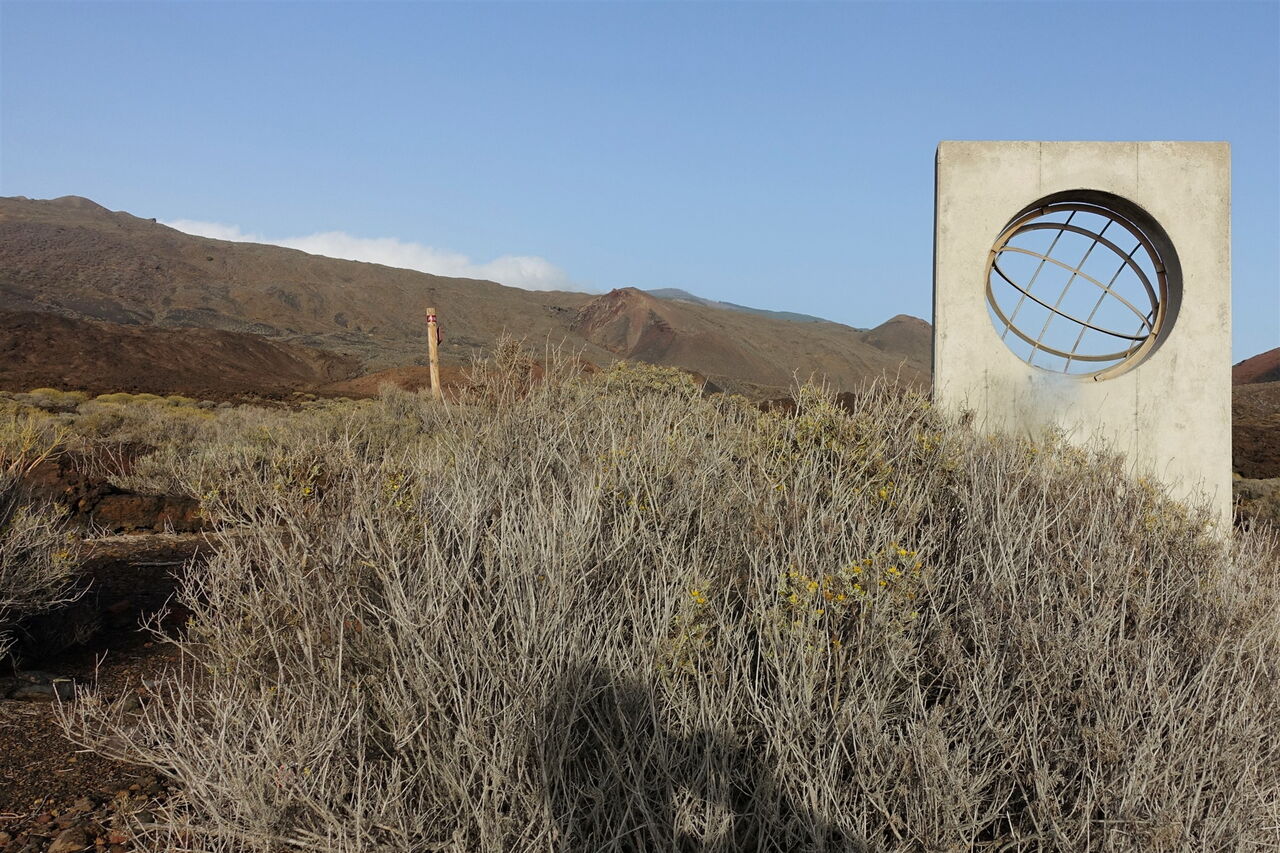An der Messsäule vorbei geht es weiter auf dem Kraterrand, wobei wir einen weiteren, rechts vor uns liegenden Nebenkrater passieren. Sobald wir die Anfahrtsstraße zum Leuchtturm sehen, steigen wir gut 80 m nach rechts ab. Bereits unterhalb des Nebenkraters queren wir diese in einer langen Rechtskehre, bis wir festeres Gestein erreichen, um dort in die Hochebene abzusteigen. Auf einer Piste gehen wir bis zur (04) Straße HI-500 (142 m) vor und folgen der Ausschilderung Richtung Nullmeridian. Nach 190 m, bei einem Steinmännchen und einer Markierung, verlassen wir die Piste auf einen Pfad.