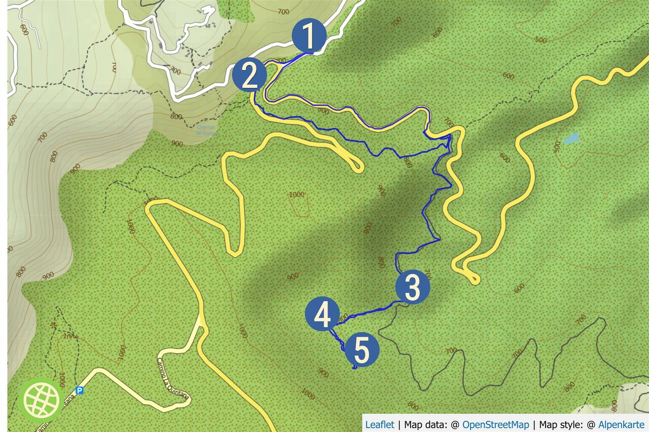 Geht man auf den Überresten der Forststraße weiter in den Wald hinein, so kommt man an einer Ruine vorbei und erreicht eine (05) Quelle (821 m). Aus 2 Holzwasserhähnen tropft frisches Quellwasser. Auf dem nachfolgenden Wegstück ist ein Weiterkommen unmöglich. Wir gehen zurück Richtung Hauptstraße, aber kurz vor dieser gehen wir links bergauf, auf dem schmalen Pfad steil bergauf durch den Wald. Schon bald hören wir die Fahrgeräusche von Autos, an einer Leitplanke erreichen wir die Straße. Nach einigen Metern rechts auf der Straße erreichen wir den Ausgangspunkt.