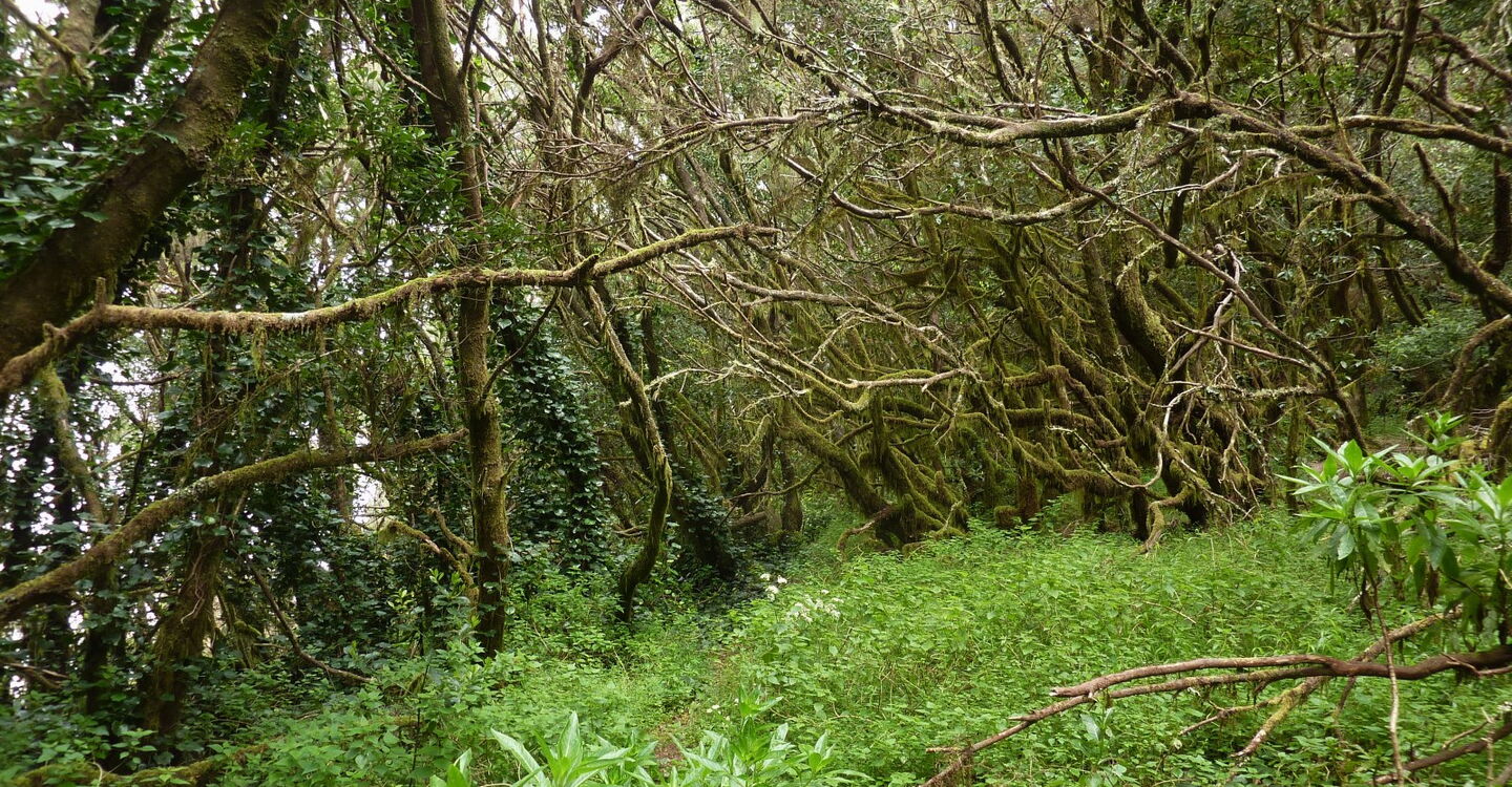 Aufgrund der windgeschützten Lage, und dass es keine Waldbrände in der jüngeren Vergangenheit gab, führt die Wanderung auf diesem Abschnitt durch den ältesten Baumbestand auf La Gomera. Nach 380 m vernimmt man das Plätschern eines Baches, und dann plötzlich taucht er aus dem Dickicht der Bäume auf, ein riesiger, 7 × 12 m großer (04) Fels (803 m). Geht man rechts oder links am Felsen vorbei, befinden sich dort noch weitere Felsen, aber nicht zu mächtig wie der am Wegesrand.
