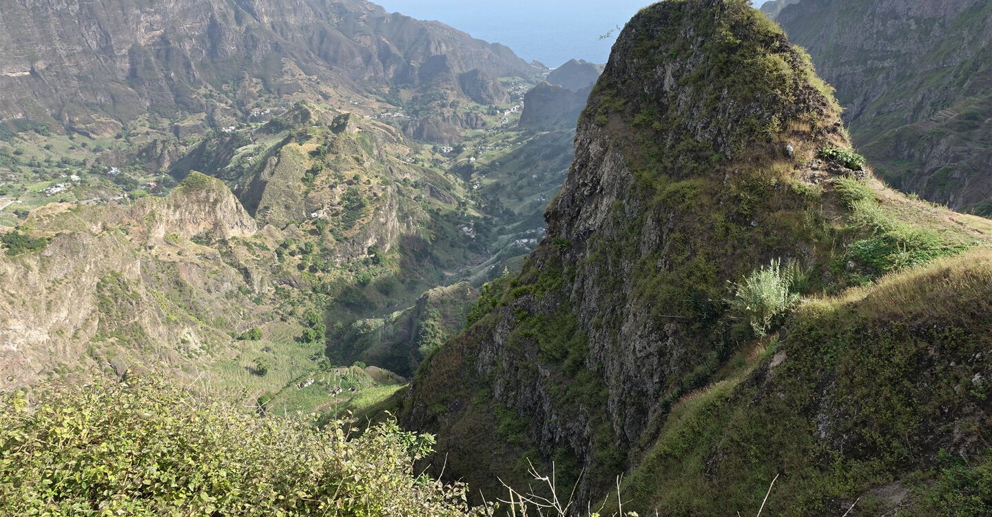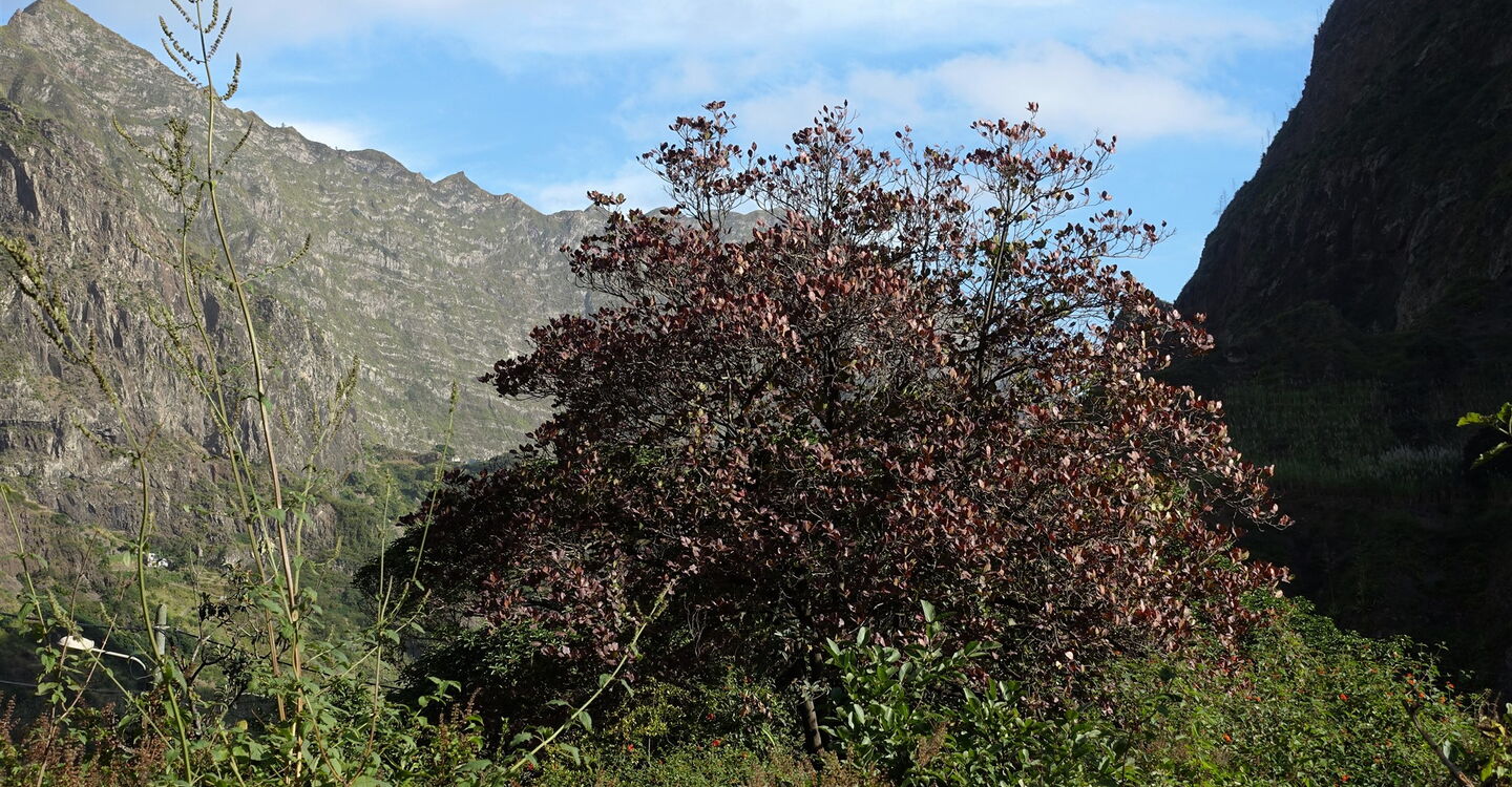 Eine interessante Variante zu der meist gegangen Route (siehe Tour 27) der Insel, mit immerhin 1500 Höhenmetern bergab, beschreibt diese Rundwanderung. Sie nimmt uns mit in die einmalige Kulturlandschaft des Figueiral de Paúl , entlang von Zuckerrohrplantagen, Bananenplantagen und den vielen Terrassenfelder mit Yamswurzelgewächsen. Wir bestaunen die künstlerisch angelegten Bewässerungssysteme. Von einem faszinierenden Aussichtsberg schaut man bis zum Talschluss, dort erheben sich hinter der Steilwand des Cabo da Ribeira die bewaldeten Felsspitzen des Vulkankraters Cova de Paúl. Richtung Schluchtauslauf sieht man das Dorf Vila das Pombas und dahinter den Atlantik. Das ganze Szenario ist von bis zu 1000 m hohen, umliegenden Berggipfeln eingefasst. Das therapeutische Plätschern des omnipräsenten Wassers ist unser Begleiter auf dem Abstieg.