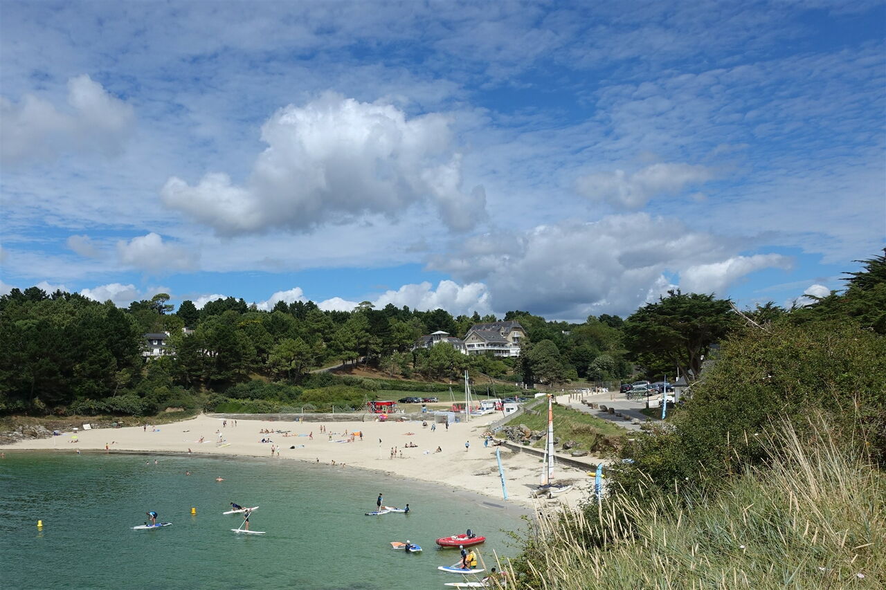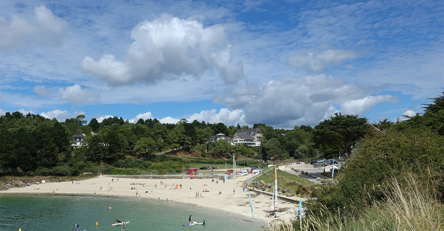 Es folgt ein wilder Küstenabschnitt mit nur wenigen Buchten. Schnell ist der kleine Badeort in der Nähe der Mündung des Belon erreicht, der 05 Plage de Kerfany (7 m). Direkt am schönen Sandstrand entlang oder über den Parkplatz erreichen wir am nördlichen Ende der Bucht ein Metallgitter. Wir folgen diesem und erreichen eine aussichtsreiche Landspitze. Über Wiesen steigen wir zur Straße auf, um dort links zu laufen und hinter dem Ehrendenkmal die Treppen herunterzugehen. Im weiteren Verlauf wird mehrmals auf- und abgestiegen. Nach einem kurzen Stück parallel zu einem Parkplatz biegen wir bei der nächsten Möglichkeit nach halb rechts ab und erreichen den Ausgangspunkt.