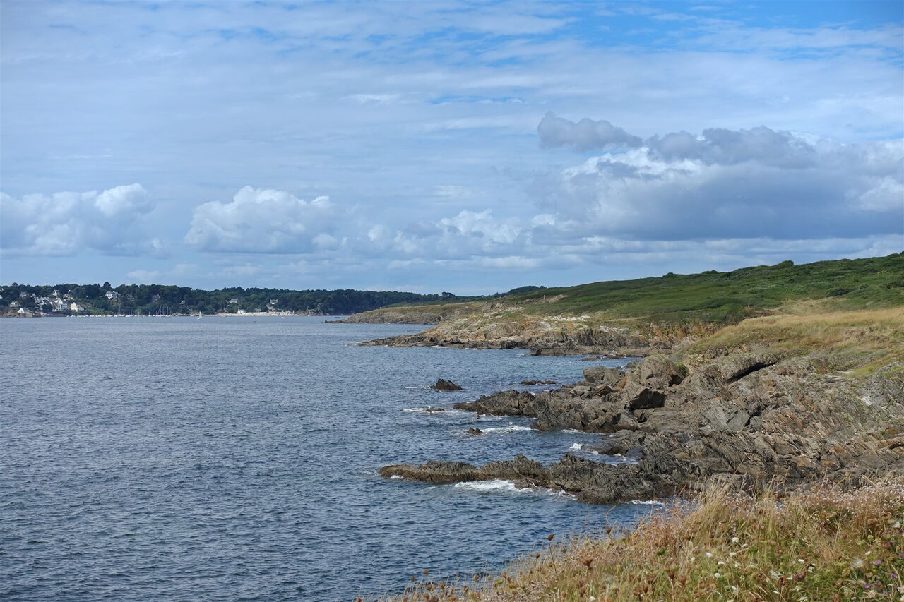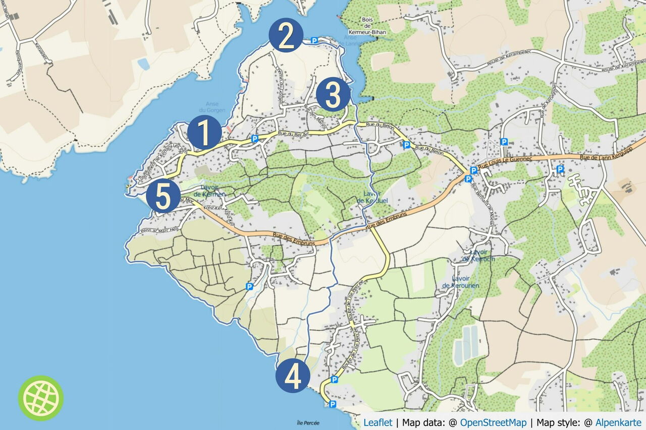 Vor der weißen Mauer gehen wir links und bei der nächsten Möglichkeit rechts in die Rue de Centre. Kurz hinter der nächsten Linkskehre der Straße und einem Holzpfeiler biegen wir halb rechts auf einen Pfad ab, gehen entlang der Überreste einer Steinmauer und biegen bei einer Weggabelung nicht halb rechts ab. Dort, wo der Weg endet, gehen wir rechts über platt geschliffene Steine. Bei der sofort darauffolgenden Weggabelung gehen wir halb links und ignorieren den nächsten linken Abzweiger. Der Pfad geht in eine Fahrspur über, die an einer Straße endet. Wir gehen 115 m bis zur Hauptstraße vor und dort rechts, um 30 m hinter dem Ortsschild Kerduel die Straße nach links zu queren und auf einem Feldweg entlang einer weißen Mauer zu wandern. Es folgen zahlreiche Wegpunkte: Es geht durch ein kleines Waldstück, von rechts mündet eine Einfahrt in unseren Weg. Sobald wir das Meer in der Ferne ausmachen können, endet unser Weg, hier gehen wir rechts. Bevor man in einen Wald eintritt, geht es auf einem schwach ausgeprägten Pfad links am Feldrand entlang. Der Weg führt durch eine Rechts- und eine Linkskehre entlang der Felder. Bei einer perfekt geschnittenen Thujenhecke biegen wir halb rechts ab und gehen nun direkt auf das Meer zu. Wir haben den Fernwanderweg 04 GR 34 (12 m) erreicht und gehen nun in nordwestlicher Richtung.