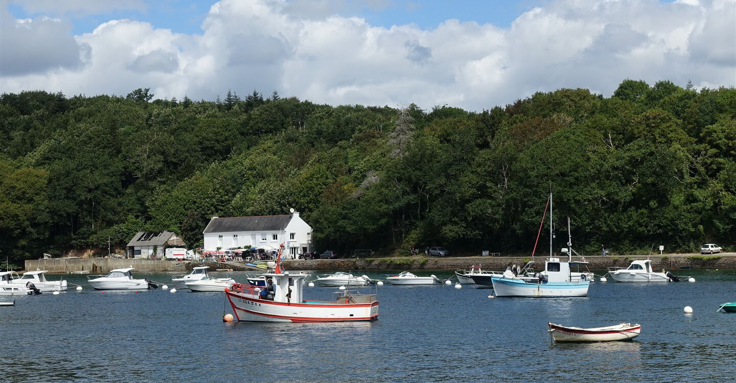 Nach einigen Metern bergab entlang eines grünen Geländers ist der 02 Port du Belon (1 m) erreicht. Wir befinden uns nun direkt an dem Austernfluss, der Wiege der flachen Auster Belon. Die einmalige und besondere Landschaft wurde schon von vielen Malern verewigt. Jeden Tag erreichen Fischerboote den kleinen Hafen, dann werden Meeresfrüchte am Pier verkauft. Auf dem Fußweg entlang der Straße gehen wir bis zu einem linken Abzweiger vor, hier geradeaus und nach 80 m auf der Straße gehen wir links zwischen der Steinmauer hindurch und gelangen zu einem malerisch gelegenen Nebenarm des Flusses.