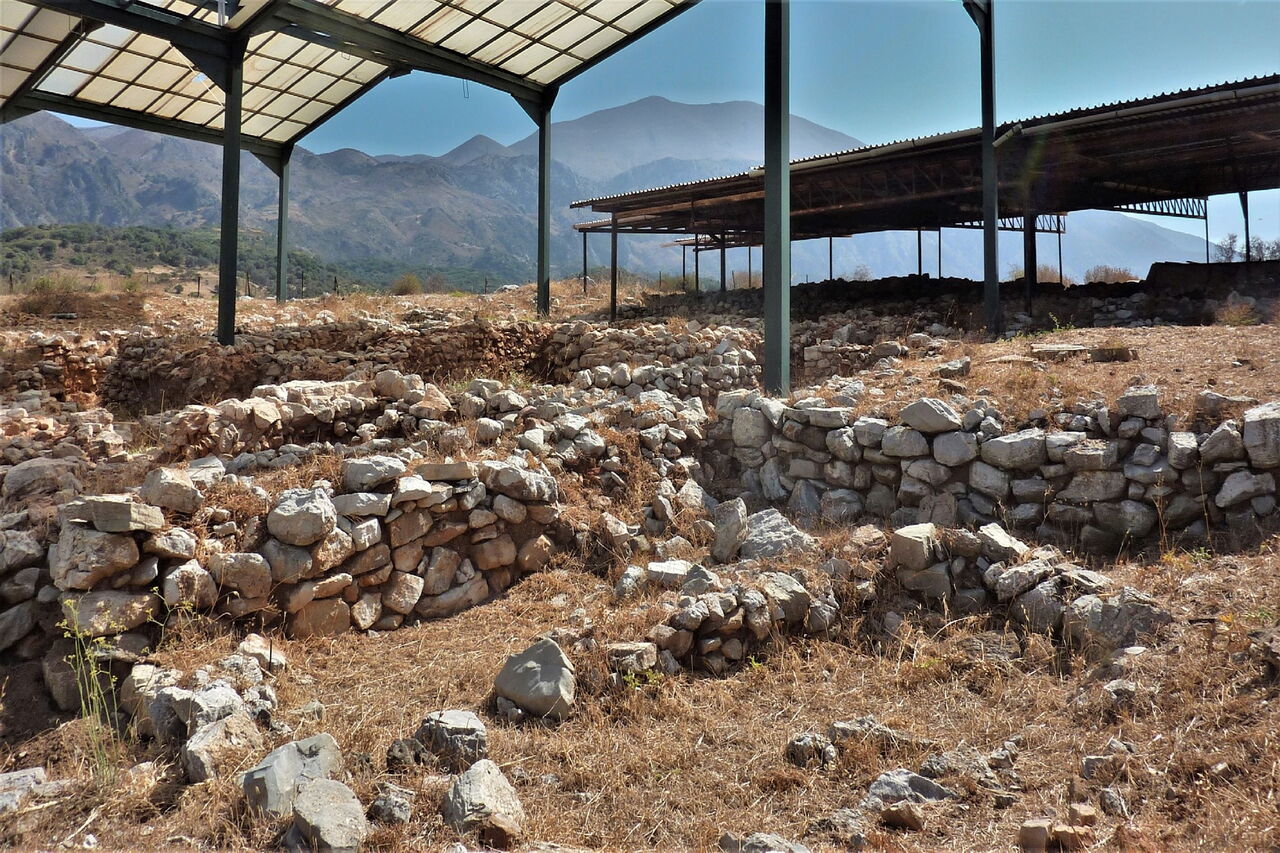 An der Weggabelung gehen wir halb links weiter, anschließend bei der nächsten Möglichkeit rechts, um nun parallel zum Wasserreservoir zu laufen. An dessen Ende bei der Weggabelung halten wir uns halb links. Nach 460 m überqueren wir eine Brücke nach links und erreichen das Dorf Lampiotes. Dort bleiben wir bei dem ersten Verkehrsspiegel auf der Hauptstraße und bei dem zweiten Verkehrsspiegel gehen wir geradeaus weiter. Nach 2,5 km erreichen wir einen Eichenwald, von links mündet eine Piste auf den Hauptweg – unser weiterer Weg, wenn wir nicht die Exkursion zum 02 palastartigen Komplex (352 m) machen. Nach weiteren 70 m gehen wir halb rechts auf dem mit einem roten Punkt markierten Pfad. Wir kommen an einer Quelle vorbei und gehen rechts durch das Dorf Monastiraki, um dann bei dem blau-grün gestrichenen Geländer rechts hinunter zu den Ruinen eines minoischen Palasts aus der Zeit von 1900 bis 1700 vor Christi zu gehen. Achtung! Die Anlage ist montags geschlossen.