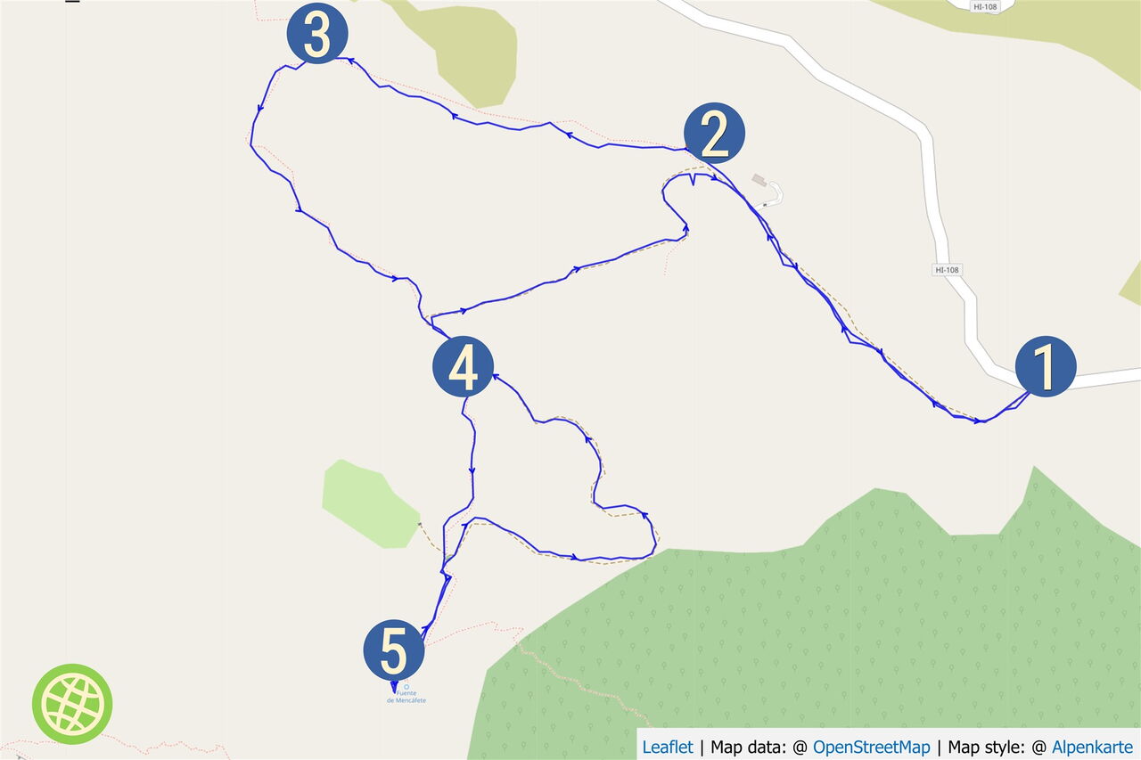 Busanbindung keine: Pkw-Anfahrt: Der Ausgangspunkt der Wanderung befindet sich 26 km von Valverde entfernt. Von dort fährt man auf der HI-1 Richtung San Andres, quert das zentrale Bergmassiv und fährt bergab Richtung Frontera. In einer Rechtskehre der Straße folgt man der Ausschilderung links Richtung Fuente Mencafete. Die Piste endet an einer Weggabelung, an der es links mit einem Vierradantrieb direkt zur Quelle geht. An dieser Stelle kann man nach 20 m bergauf bequem parken. Es führt auch noch eine Piste extrem steil bergauf von Sabinosa, aber von der Anfahrt aus dieser Richtung ist abzuraten. Geokoordinaten: 27.736367 -18.080483.