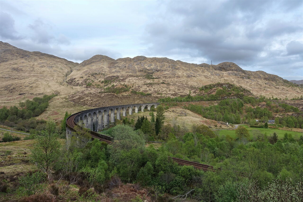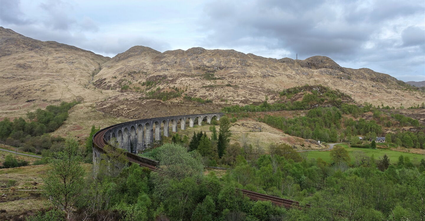 Das Glenfinnan Viaduct liegt auf der Eisenbahnstrecke zwischen Fort William und Mallaig in den West Highlands. Es wurde zwischen Juli 1897 und Oktober 1898 erbaut und am 14. April 1901 eröffnet. Richtig berühmt wurde das Bauwerk durch die Harry-Potter-Filme und den Hogwarts Express, der in vielen Szenen über diese Brücke fährt. Auch gibt es das Glenfinnan Monument zu bestaunen, das sich stolz am Ufer des Loch Shiel erhebt. Es markiert die Stelle, an der 1745 der schottische Thronanwärter Bonnie Prince Charlie an Land gingen, um anschließend den Jakobitenaufstand anzuführen. Die heutige Runde ist mehr ein kultureller Ausflug als eine Wanderung. Zum Ausklang der abendlichen Runde – hier ergeben sich die besten Lichtverhältnisse – liegt am Wegesrand ein sehr gutes Restaurant mit einem wunderschönen Blick über den Loch Shiel.