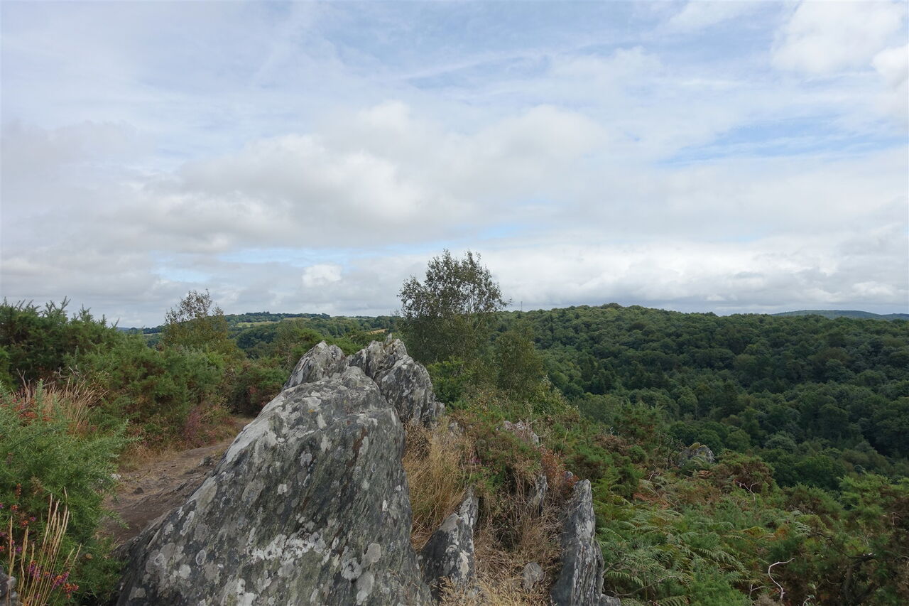 Bei einer Weggabelung – nach links ist der Pfad weiß-rot ausgestrichen – gehen wir halb rechts auf einem wunderschönen Höhenweg direkt durch die steilen Hänge oberhalb der Schlucht 02 Gorges du Daoulas (230 m). Zwischen Ginster und Heideflächen erreichen wir einen mit Holz gesicherten spektakulären Aussichtspunkt. Man blickt tief in die Schlucht bis zur Straße herunter und weit über die sanft hügelige Landschaft, rechts sieht man die Abtei. Der Pfad gibt den weiteren Weg vor. Wir ignorieren zwei rechte Abzweiger zur Straße herunter. Im weiteren Verlauf folgen wir der Ausschilderung Richtung Laniscat. Durch beinahe alpines Terrain steigen wir bis zu einem Bergkamm auf, weitere wunderschöne Aussichtspunkte folgen.