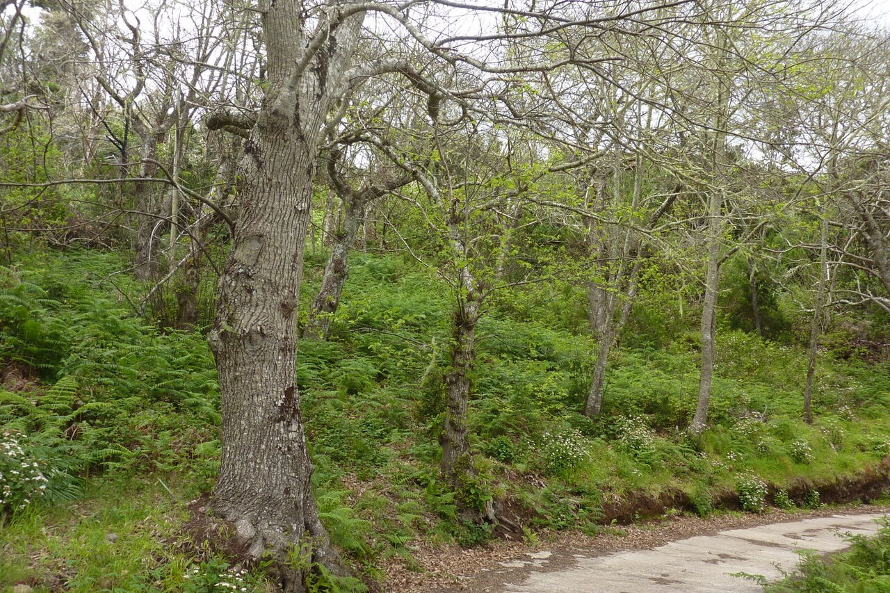 Inzwischen ist die Vegetation dichter geworden. Wir haben ein Barranco überquert und am Ende einer grünen Leitplanke - in (03) Los Acevinos (824 m) - gehen wir scharf links auf das gelbe Haus mit dem grünen Fenster zu, um am Ende des Grundstücks nach einem kurzen Abstieg auf der folgenden Betonstraße rechts weiterzuwandern.