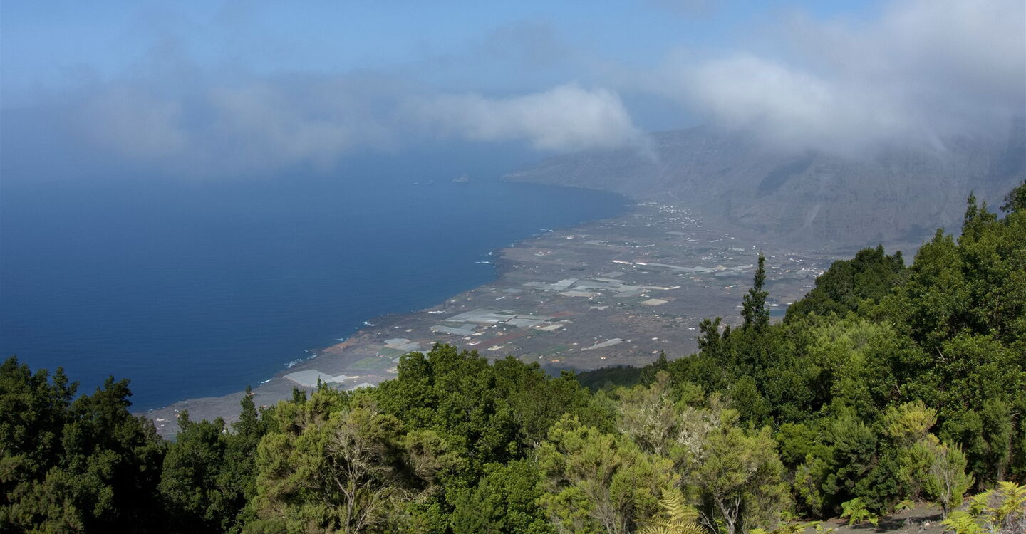 450 m hinter einem schwarzen Lapilli-Feld, das sich den Hang hinaufzieht – die Piste macht hier eine leichte Rechtskehre –, erreicht man weglos halb links über Vulkangestein einen wunderschönen Aussichtspunkt. Wir setzen unseren ursprünglichen Weg fort. Auf der Verbindungsstraße (03) HI-1 (1053 m) gehen wir 60 m links Richtung Frontera, um dann rechts auf die betonierte Piste zu biegen. Diese geht in eine Sandpiste über und bei der Weggabelung gehen wir halb rechts über die Absperrkette. Auf dem nachfolgenden Wegstück ist der Wald besonders dicht gewachsen und die Bäume sind sehr hoch – ihre Blätter bilden einen zweiten Himmel.