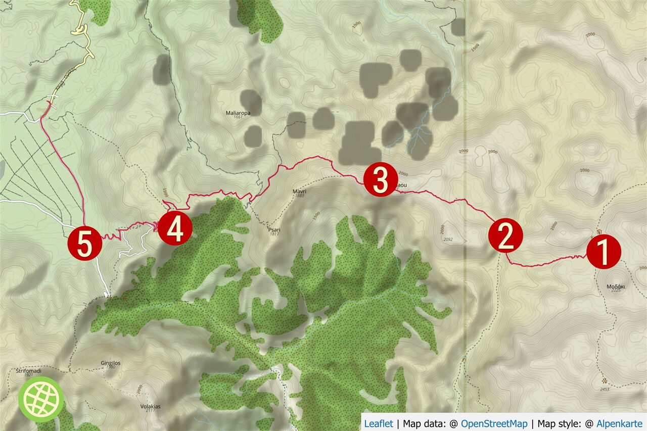 Nach 600 m erreichen wir einen Erdhügel, der aussieht wie ein Damm. Vor uns befindet sich eine kleine Ebene, genannt 02 Papasifis (1779 m). Dort befindet sich eine Schäferhütte, in der man Zuflucht finden kann, sowie eine Zisterne für Regenwasser. Kein Trinkwasser! Hier gehen wir einige Meter links über den Damm, um dann in dem in westliche Richtung verlaufenden Seitental aufzusteigen. Wir erreichen eine weitere Steinhütte und überqueren eine Ebene direkt auf einen Hügel zu. An diesem gehen wir links vorbei, um nach 500 m eine weitere Hochebene zu erreichen. Direkt hinter einem großen Wasserloch gehen wir halb links bergauf, Markierungen helfen bei der Orientierung.
