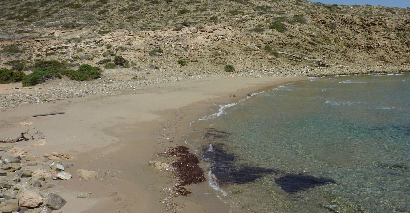 Nach 200 m, noch vor dem tiefsten Punkt in der Senke, verlässt ein Pfad den Hauptweg nach rechts und wir erreichen einen (05) Secret Beach (1 m). Die kleine Sandbucht ist nur 60 m breit und lädt zum Verweilen ein. Für den weiteren Rückweg gehen wir 50 m landeinwärts, um dann scharf rechts auf die Klippe zu steigen und bei einem Steinmännchen dem Pfad zu folgen. Angekommen auf dem Bergrücken, gehen wir nicht links bergauf, sondern bleiben auf einem Pfad, der oberhalb der Küstenlinie Richtung Osten verläuft, bis wir den breiten Strand von Prasonissi sehen und uns in Richtung der bekannten Ruine vom Hinweg orientieren. Nachdem wir quer über die Sandbank gegangen sind, erreichen wir unser Ziel.