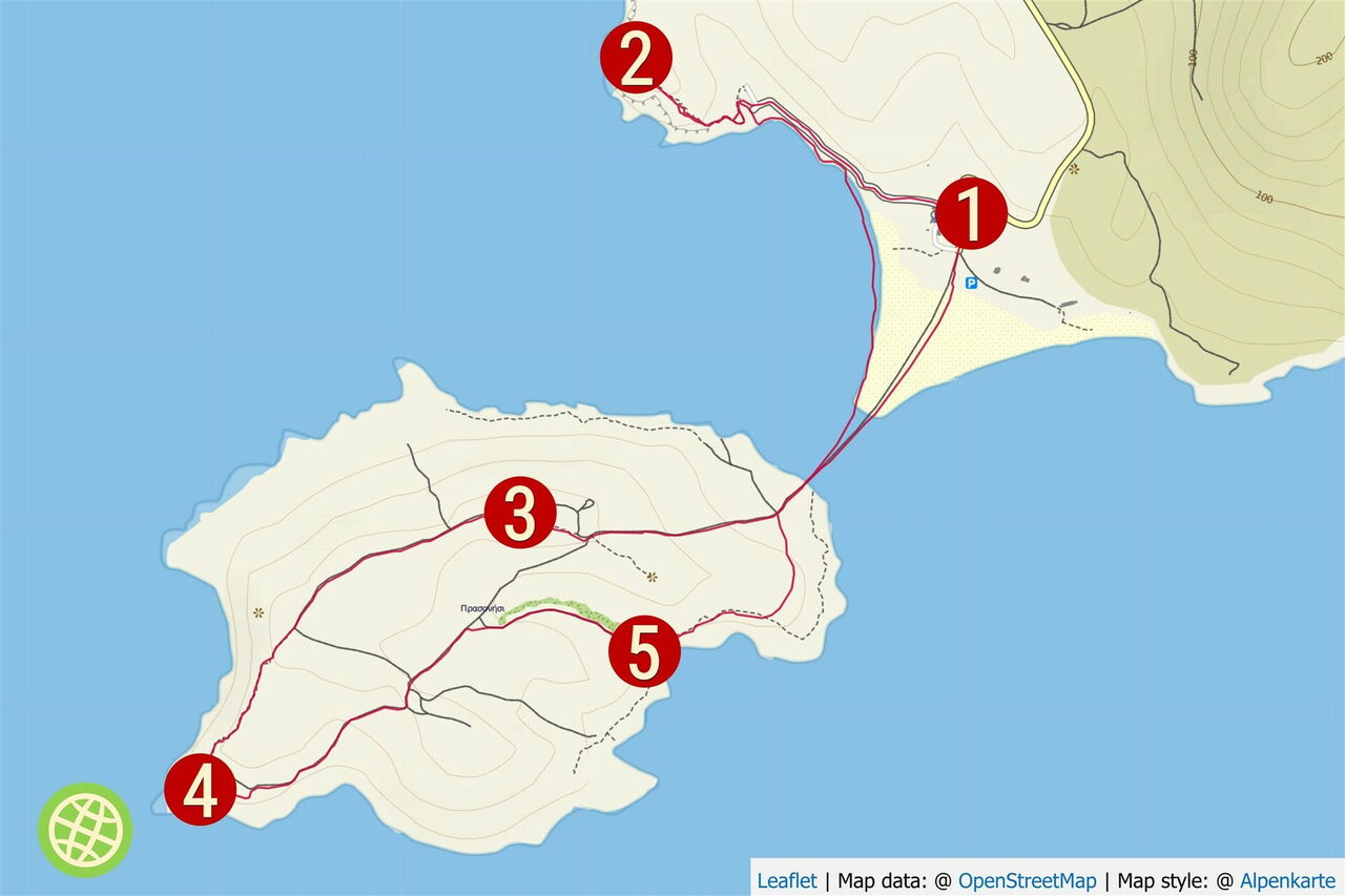 Einfache Wanderung bei stets eindeutiger Wegführung. Aber Achtung! Bei Sturm mit hohem Wellengang wird die Halbinsel regelmäßig überflutet. Je nach Strömung entsteht ein bleibender Durchbruch durch die Sandbank. Eine Durchquerung des Kanals sollte mit Vorsicht angegangen werden, da es dabei schon zu Todesfällen gekommen ist. Art des Weges: 20 % Strand, 20 % Pfade und 60 % Schotterpiste. Ausrüstungsempfehlung: Sonnenschutz und Badesachen. Einkehr: Tavernen in Prasonissi. Beste Jahreszeit für diese Tour: April bis Oktober. Sehenswert: die antiken Spuren der Festungsstadt Vroulia aus der Zeit um 700 vor Christi.