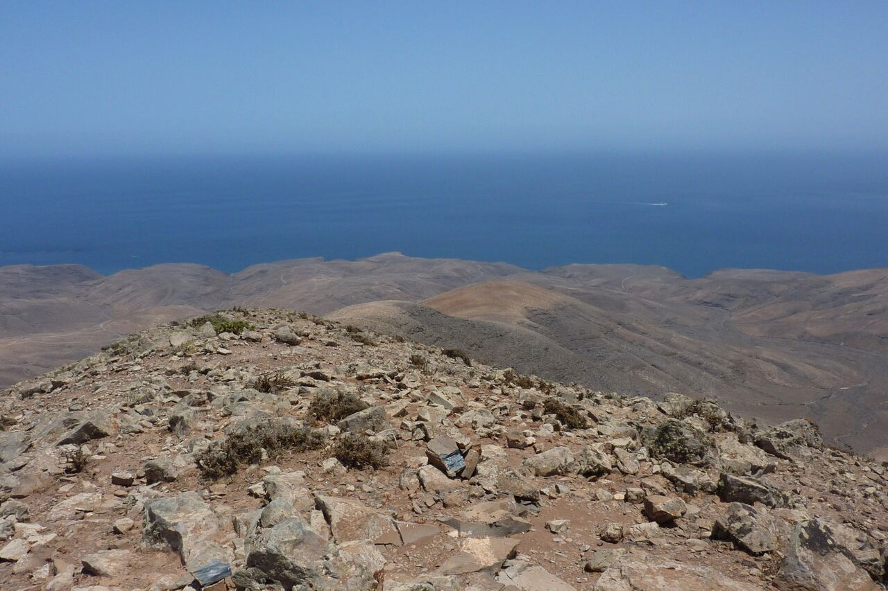 Als weitere Orientierungshilfe halten wir uns nun immer mittig auf dem Bergkamm, bis wir den Gipfel des (02) Hacha Grande (561 m) erklommen haben. Das Hacha-Grande-Gebirgsmassiv setzt sich aus 3 markanten Bergrücken zusammen, die aufeinander zulaufen. Über den Bergrücken aus südwestlicher Richtung sind wir aufgestiegen. In nördlicher Richtung führt ein Wanderweg nach Femès. In südöstlicher Richtung schlängelt sich ein Bergrücken bis an die Küste herunter.