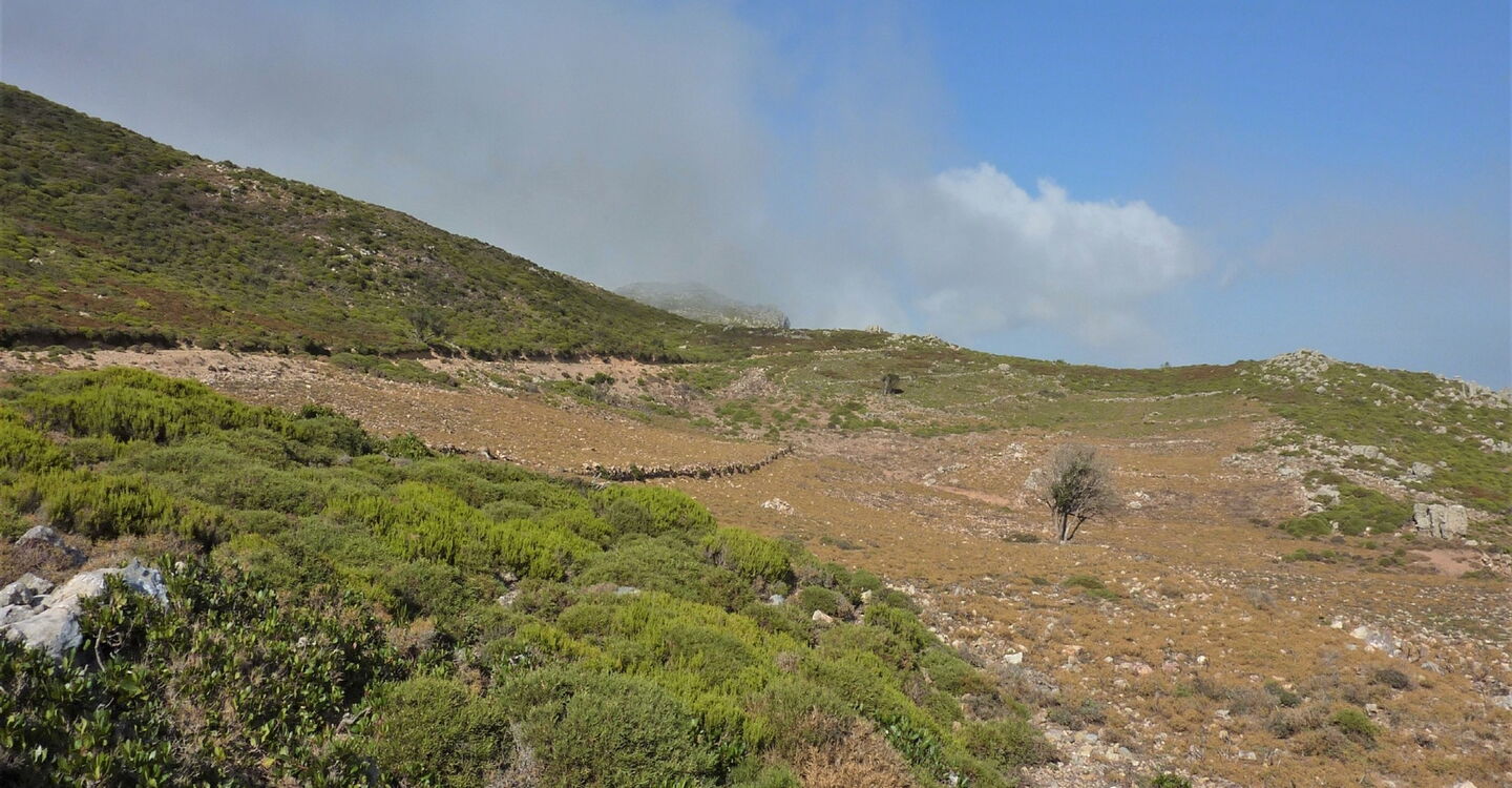 Im weiteren Verlauf kommen wir an einem stark löchrigen Maschendrahtzaun entlang. Ab hier ist ein Pfad auszumachen und wir steigen abermals auf einen kleinen Berg, der höchste Punkt ist durch eine Messsäule aus Beton markiert. Ja, wir treffen abermals auf einen Ziegenzaun, hier gehen wir nun auf der rechten Seite des Zauns in Richtung des nächsten kleinen Gipfels, dem 04 Mikro Kefali (840 m). Da dieser Zaun quer über den Gipfel verläuft – Wer hat sich das bloß so ausgedacht?! –, können wir nur leicht rechts unterhalb des Gipfels durch steiles Gelände queren, um parallel zu dem Zaun steil und auf gerölligem Untergrund zur unterhalb liegenden Piste abzusteigen.