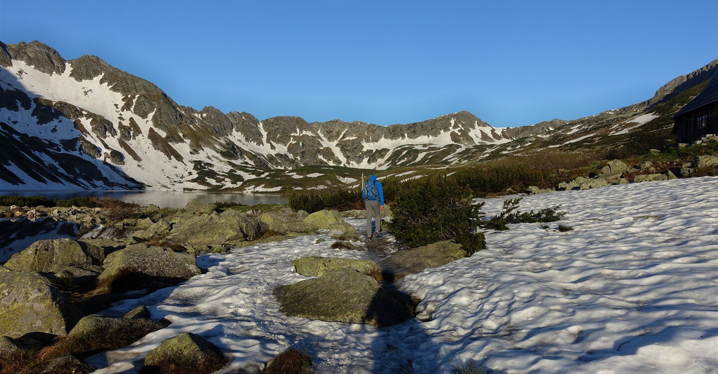 Von der 01 Fünf-Polnische-Seen-Hütte (1670 m) gehen wir in nordwestlicher Richtung auf dem blau markierten Wanderweg durch das Dolina Pięciu Stawów Polskich. Wir queren den Abfluss des Sees Wielki Staw Poliski und ignorieren die nachfolgenden drei Abzweiger (gelb, schwarz, gelb markiert), allesamt führen auf den Orla-Perć-Höhenweg.