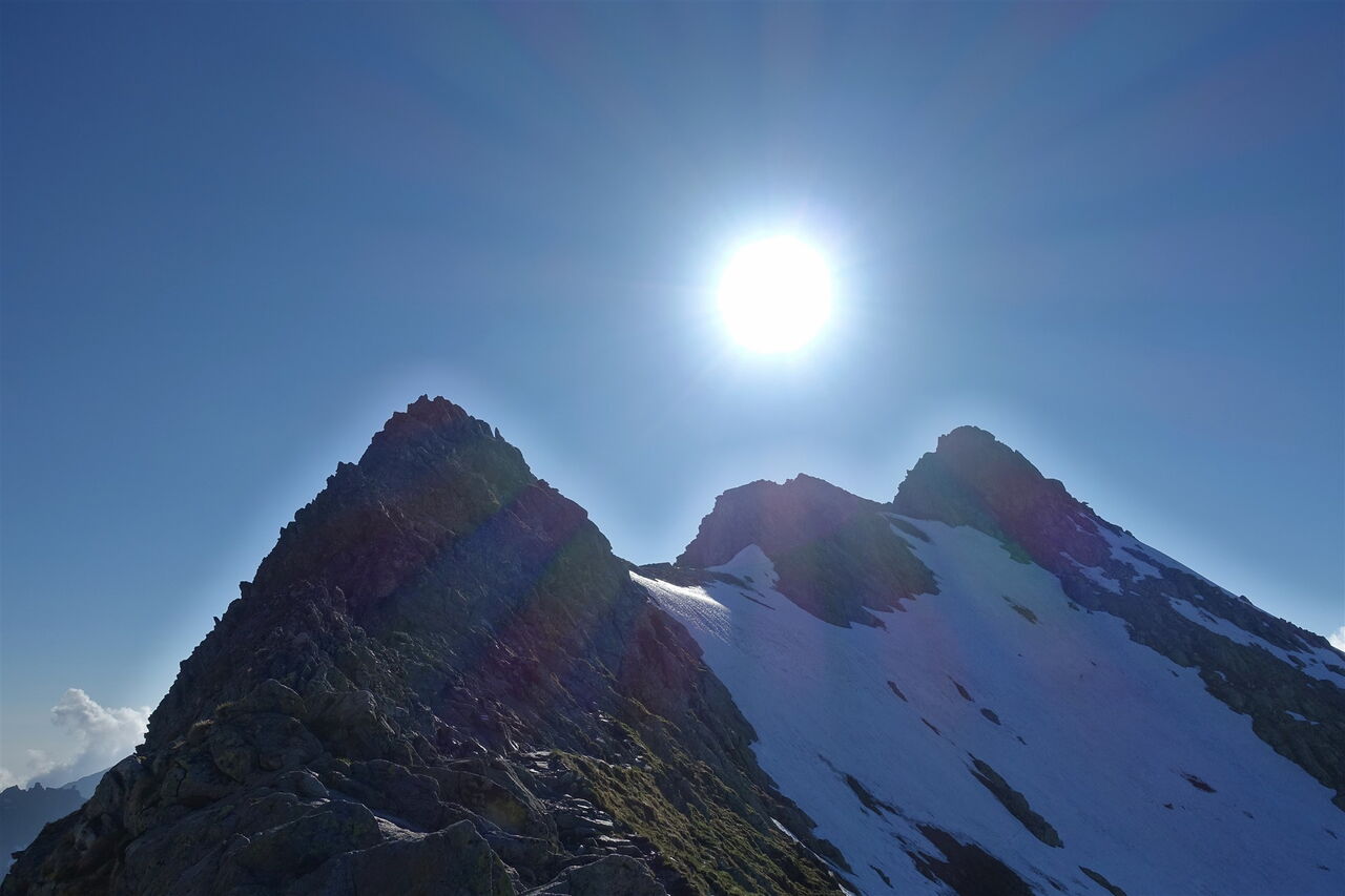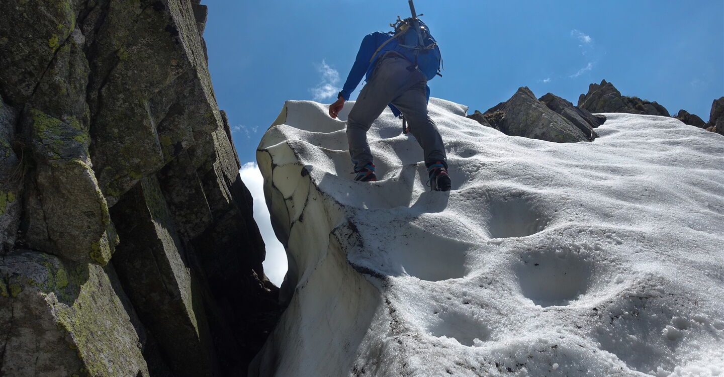 Notabstieg: Hinter der Einsattelung Przełączka nad Dolinką Buczynową führt links ein schwarzer Abstieg zur Hütte Schronisko PTTK Murowaniec. Nach 25 Minuten führt links ein grüner Steig bergab, auch dieser führt zur Hütte Schronisko PTTK Murowaniec. Weiter auf dem Höhenweg: Es erfolgt ein längerer Abstieg unterhalb des nördlichen Bergkamms, um dann rechts steil durch einen spektakulären Kamin aufzusteigen, den Komin pod Czarnym Mniszkiem. Wir erreichen den markanten Gipfel des 04 Skrajny Granat (2225 m). Hier beginnt dann ein luftiges Kletterabenteuer mit vielen ausgesetzten Passagen, Kettensicherungen und Eisenleitern. Der Klettersteig ist vorgegeben und bedarf keiner weiteren Erklärung. In den schattigen Lagen liegt noch bis Mitte Juni Schnee!