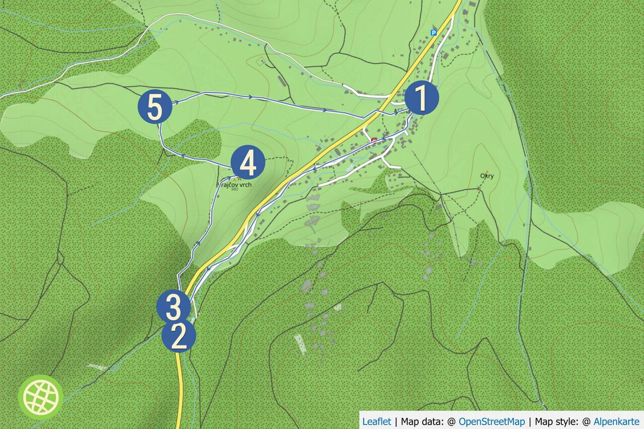 Auf dem Hauptweg durch das Dorf 04 Nižná Boca (833 m) angelangt, gehen wir rechts und bewundern das kulturelle Erbe des Dorfes. In dem ruhig gelegenen Tal Rovná wandern wir an der alten und neuen Kirche, wunderschönen Holzhäusern und Bergbauhäusern vorbei. Erstmals urkundlich erwähnt wurde der Ort 1271, die Bergbaugeschichte geht bis in das Jahr 1285 zurück.