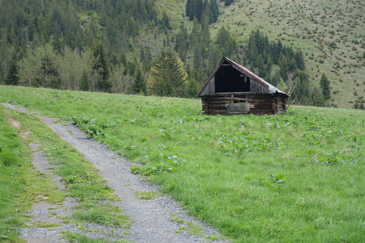 Kurz vor einer vereinzelten Feldscheune folgen wir dem rechten 03 Abzweiger (969 m) talwärts. Im Tal sehen wir die Kirchturmspitze des Dorfes Nižná Boca. Bei dem braunen Haus, der Bushaltestelle, überqueren wir die Hauptstraße nach links und folgen dem weiterführenden Pfad, um an der sofort folgenden Weggabelung halb links zu gehen.