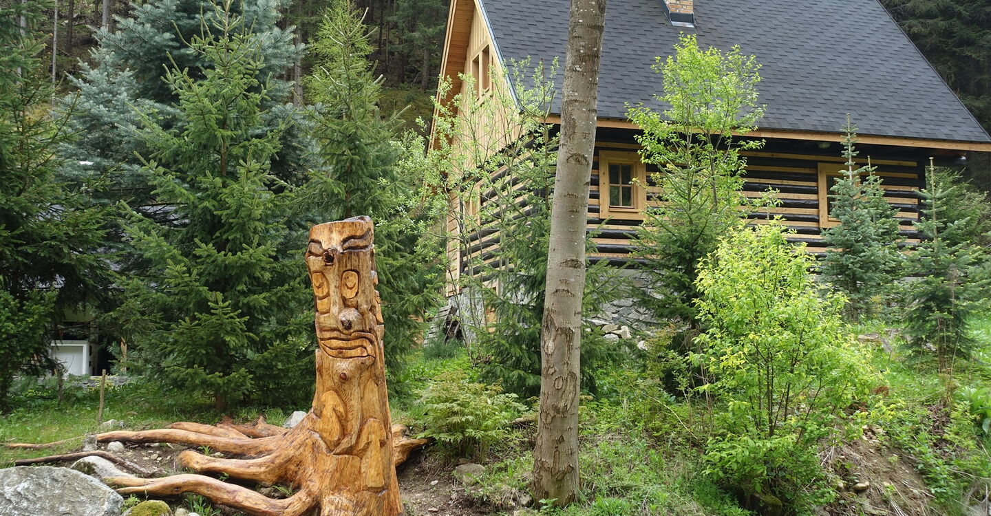 Vom Parkplatz 01 Parkovanie (908 m) überqueren wir die Hauptstraße und steigen auf dem gegenüberliegenden schmalen Pfad auf. Auf einem Holzschild befindet sich das Bild des hölzernen Aussichtsturms – unser Wegweiser.