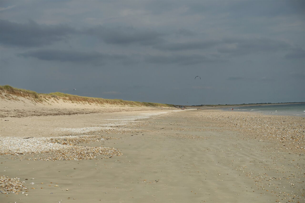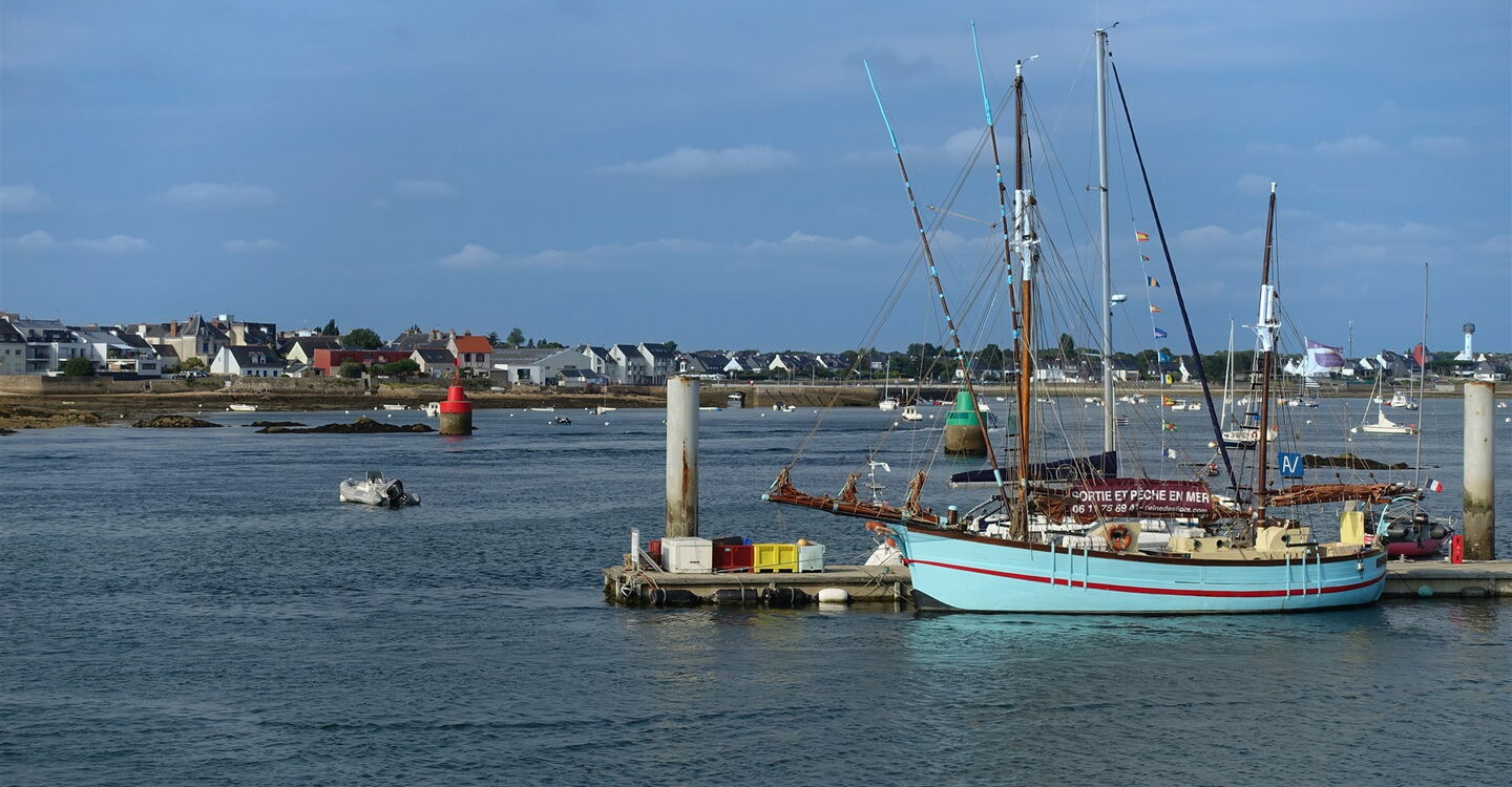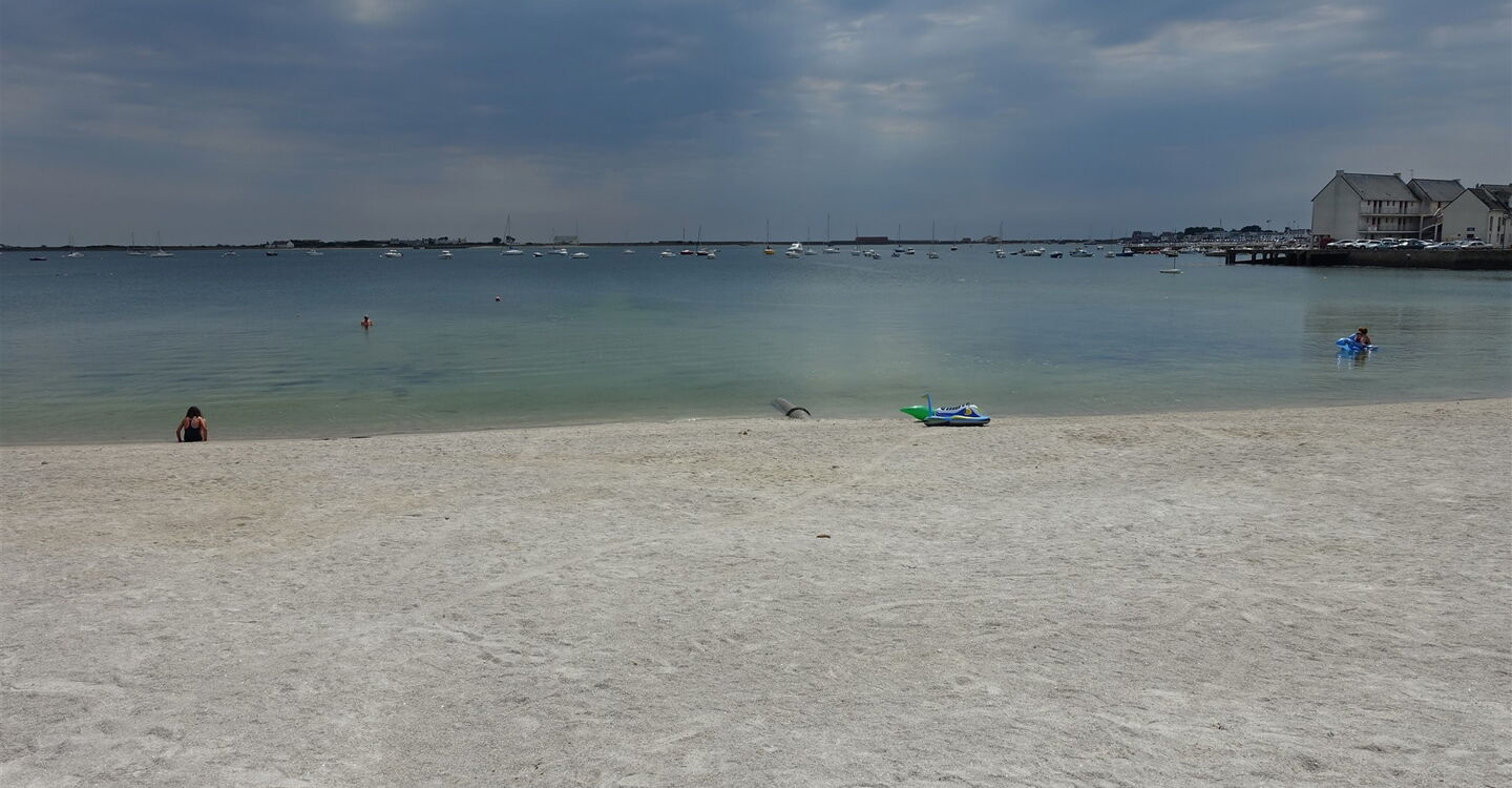 Es folgt ein langer und wunderschöner Strandspaziergang entlang der höchsten Dünen der Bretagne. Hinter einer langen Holzbarriere, die bis in das Meer ragt, gefolgt von einer Sanddüne, gehen wir direkt auf einen Steindamm zu. Wir haben die ersten Häuser der Ortschaft 05 Gâvres (2 m) erreicht. 285 m hinter dem Steindamm, bei einer Betonwand, verlassen wir den Strand über Treppen und gelangen auf einen Parkplatz. Wir gehen bis zur Hauptstraße vor, an dieser links und nach 80 m sofort rechts an der Steinmauer entlang. Am Pier gehen wir nun in nordwestliche Richtung bis zum Anleger, es folgt die Bootspassage.