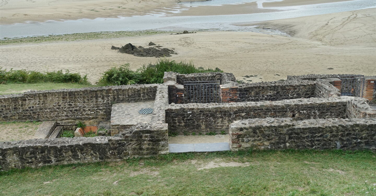 Sobald die Straße zum Strand herunterführt, zweigen wir halb links auf den Pfad durch den Kiefernwald ab. Erhöht von den Klippen aus schaut man auf das Grève des Curés mit der dahinter liegenden Bucht Locquirec. Sobald wir parallel zur Straße gehen, treffen wir auf erstaunlich gut erhaltene gallo-römische Thermen, die 05 Thermes Gallo Romains du Hogolo (16 m). Sie stammen aus dem Jahre 50 n. Chr., sind 1992 restauriert worden und seitdem für die Öffentlichkeit zugänglich. Wir gehen auf dem Küstenpfad weiter und erreichen den Ausgangspunkt.