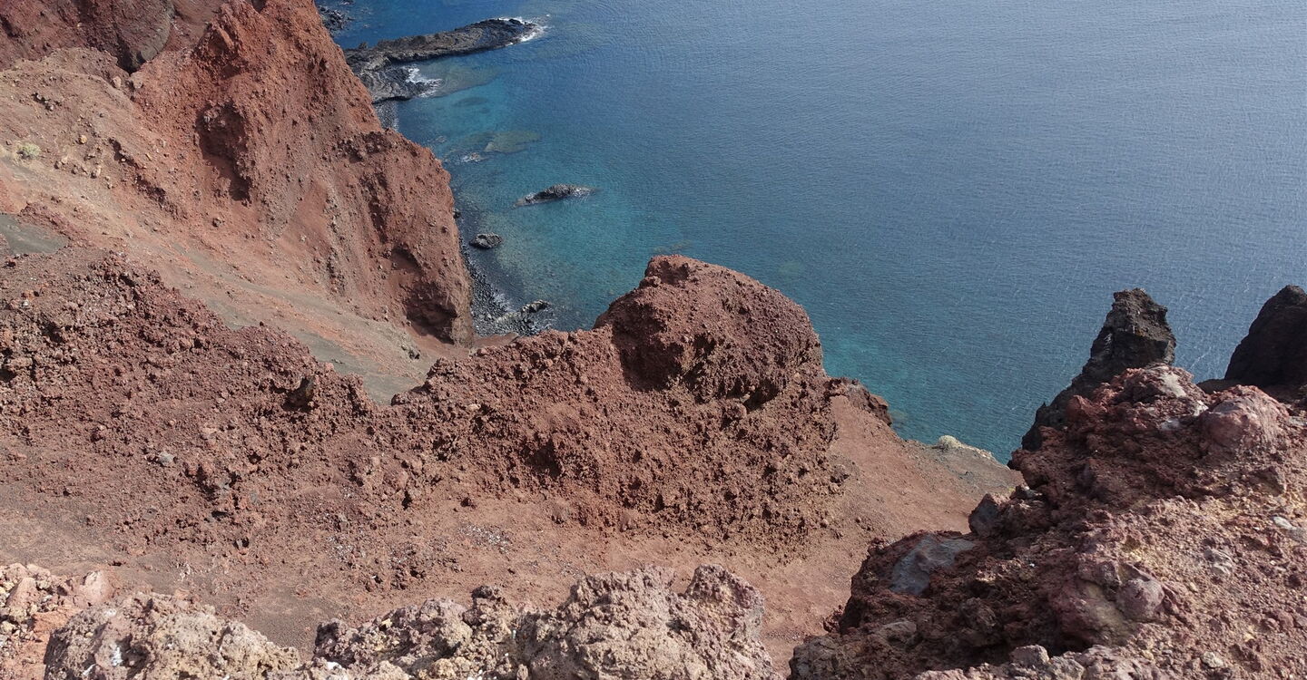 Von nun steigen wir auf Ziegenpfaden auf dem halb rechts von uns liegenden Bergrücken bis zum Gipfel der (05) Montana Restinga (209 m) auf. Dabei kann es sehr windig werden, denn die Passatwinde treffen ungebremst auf die ersten Hügelketten von El Hierro. Am Gipfel angekommen, schauen wir aus der Vogelperspektive auf das kleine Fischerdorf La Restinga. Zum Abstieg gehen wir weitere 70 m halb links auf dem Vulkankrater, um uns dann auf einem nicht so steilen, aber trotzdem gerölligen und rutschigen Untergrund in Richtung des rotbraunen Gebäudes zu orientieren, welches sich halb links unterhalb befindet. Kurz unterhalb des Gebäudes steht ein Strommast, bei dem wir auf einen Pfad Richtung La Restinga treffen. Dieser führt an der Bushaltestelle vorbei und auf einer der Straßen geht es bis zum Hafengelände herunter.
